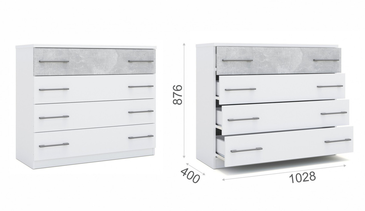 Комод «Аврора» в элегантном цвете белый и ателье светлый — это идеальное решение для тех, кто ищет практичность и стиль в одном изделии. С четырьмя просторными выдвижными ящиками, он обеспечит удобное и функциональное хранение ваших вещей. Ящики оснащены телескопическими направляющими полного выдвижения, что гарантирует легкость в использовании и долговечность.