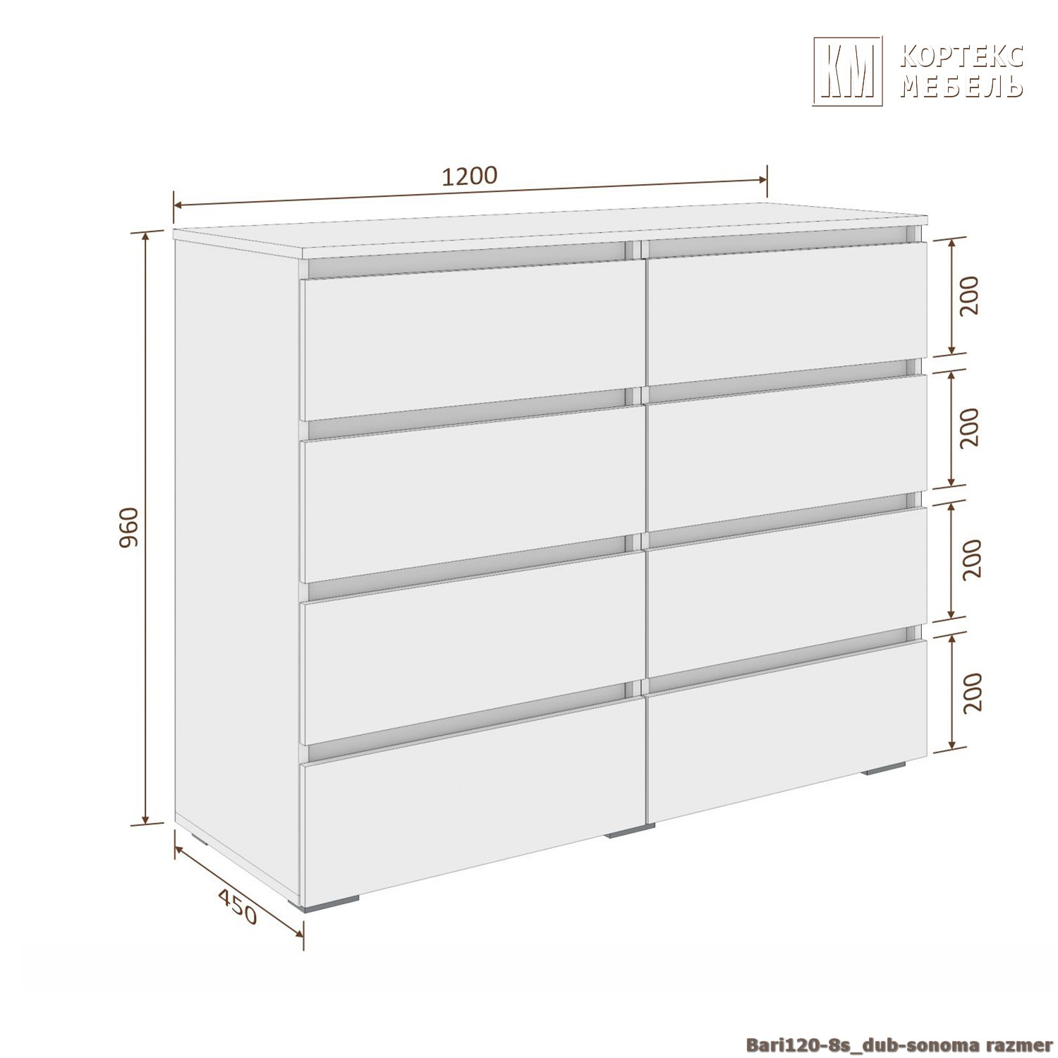 Глубина комода 45 см. делает его удобным для использования даже в небольших жилых комнатах (спальне, детской, гостиной или прихожей).