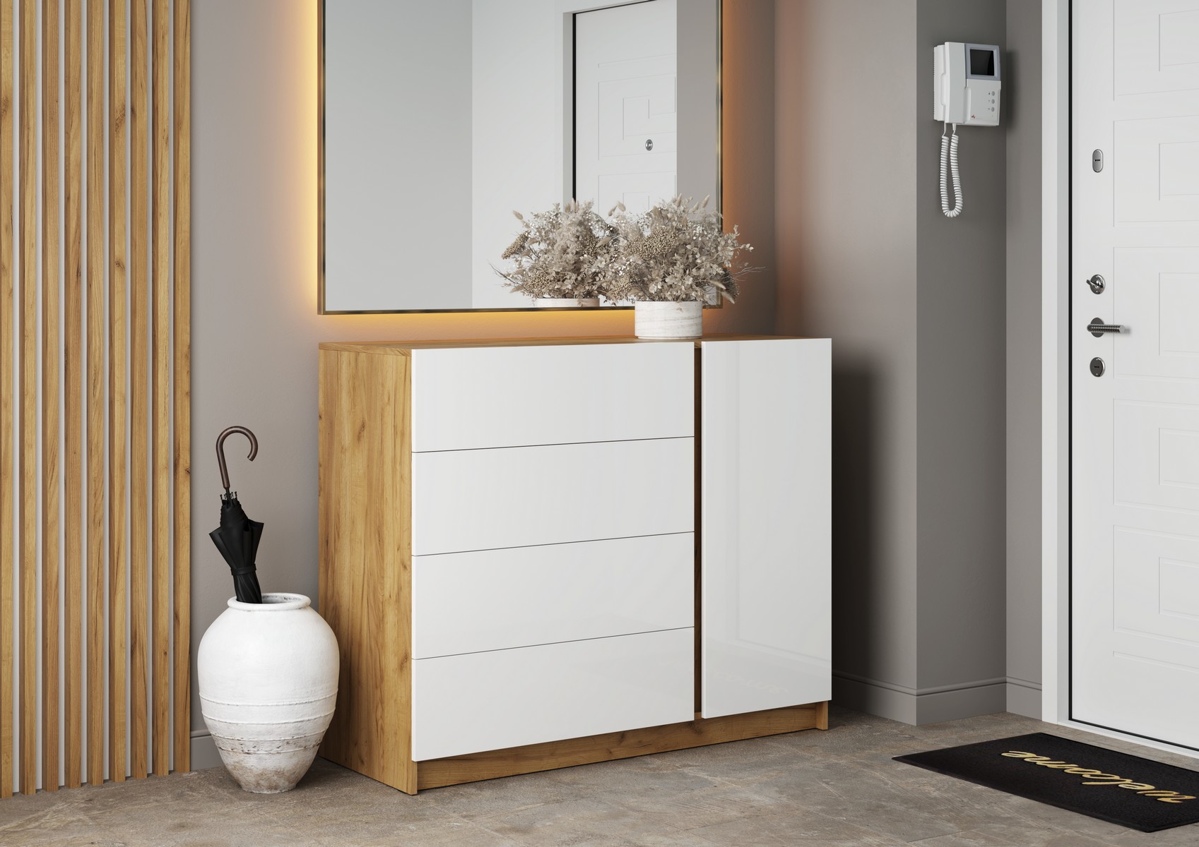 Матовый корпус и глянцевая створка. Четыре выдвижных ящика. Фасад без ручек.