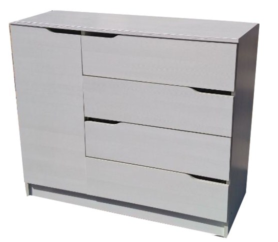 Комод с интегрированными ручками. Белый фасад, серые вставки. Ширина – 110 см.