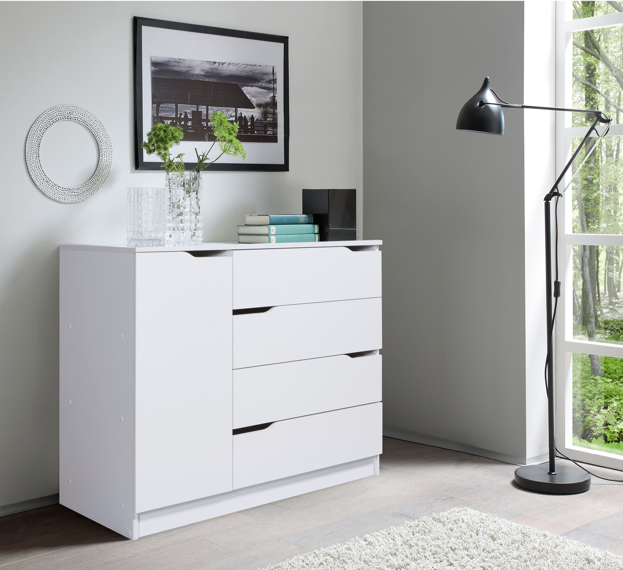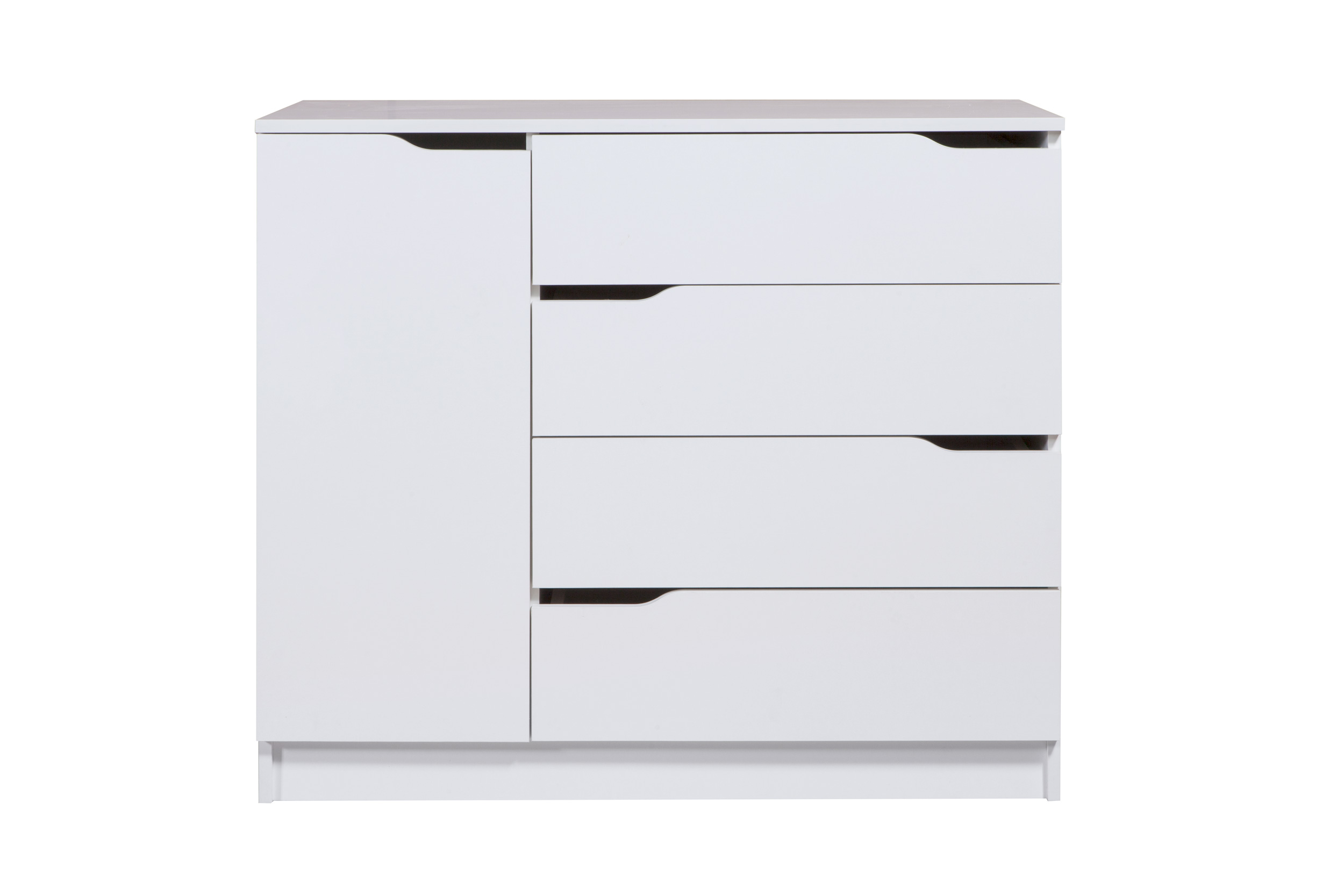 Комод «Бремен» - оригинальная модель в современном стиле. Удобная комбинированная конструкция комода повышает его функциональность и уровень комфорта в спальне, детской или прихожей. Четыре вместительные выдвижные ящика комода расположены справа, слева - за распашной дверкой отделение с полкой. Универсальной сборки нет. Классическая форма модели креативно обогащена оригинальным новаторским решением - открыванием ящиков без ручек.