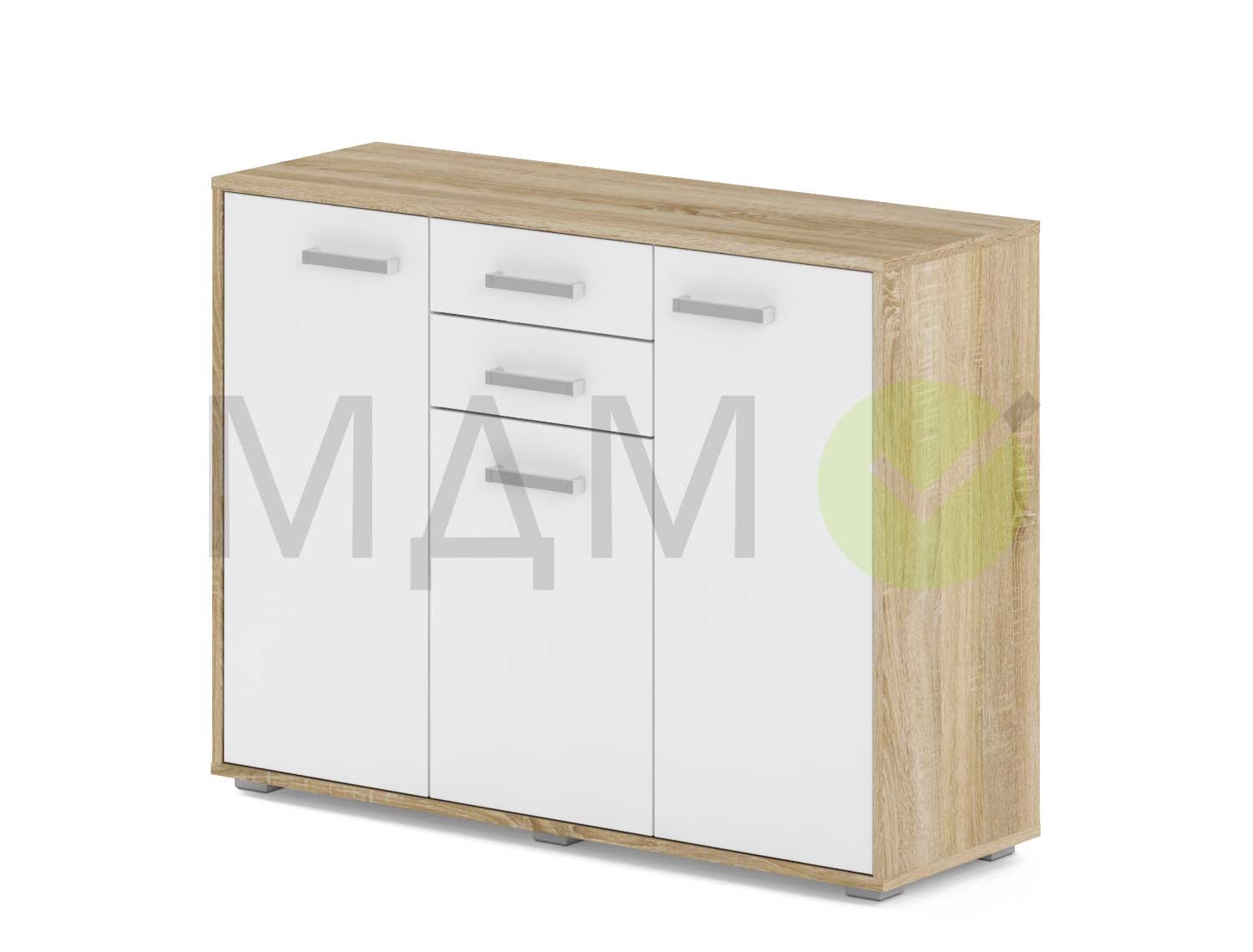 Ширина – 110 см. Комод имеет три выдвижных ящика и два закрытых отделения.