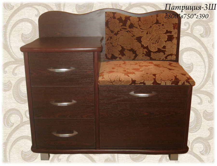 Комод «Патриция-3Ш» включает в себя три выдвижных ящика и один распашной для обуви. Приятным дополнением станет наличие мягкого сиденья со спинкой. Качественные материалы изготовления гарантируют длительный срок службы.