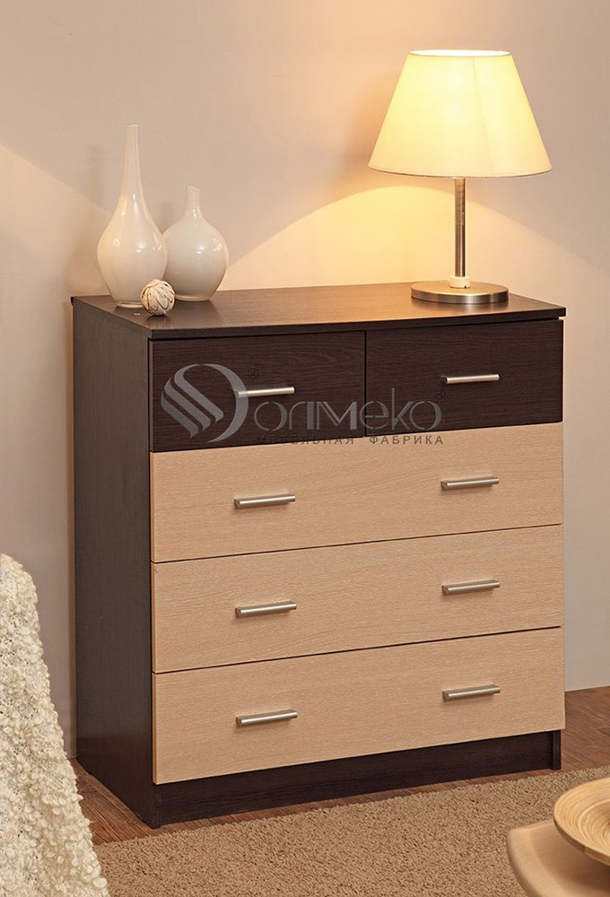 Современный комод «Дуэт-12» в современном стиле выполнен в комбинированном цвете: каркас и два верхних выдвижных ящика в цвете венге под дерево, три нижних ящика в цвете дуб линдберг. Фасад комода декорирован очень стильными горизонтальными ручками из алюминия. Просторную столешницу можно использовать для элементов декора и небольших вещей.