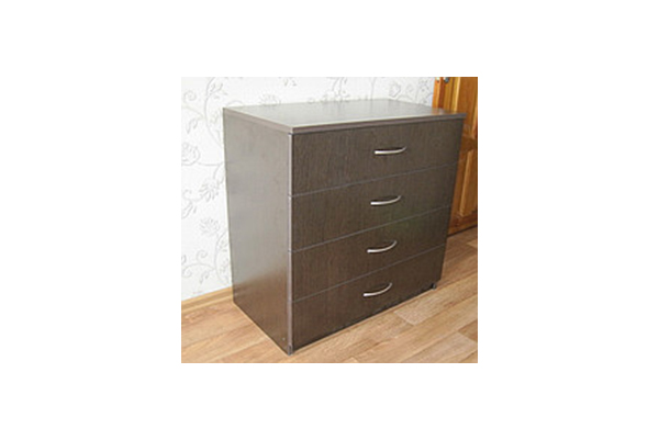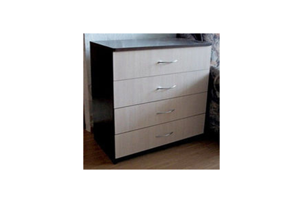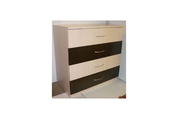 Комод с двухцветным фасадом (венге темный/дуб беленый) выполнен из прочного и долговечного ЛДСП. В комплекте имеется четыре вместительных выдвижных ящика с металлическими ручками полукруглой формы.