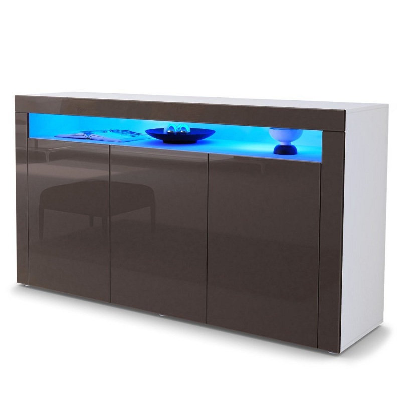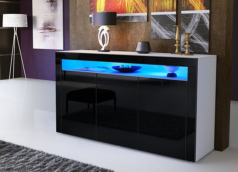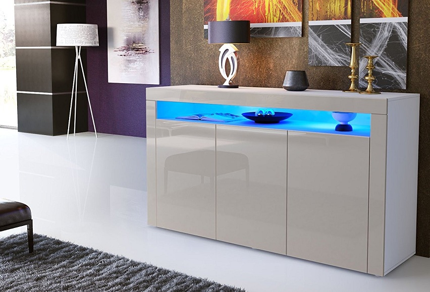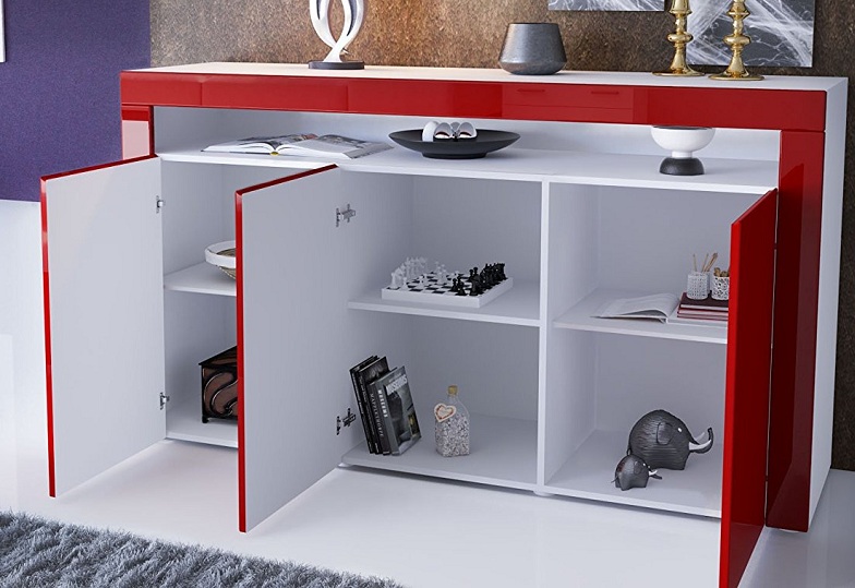 Комод может выполнять различные функции, имеет три открывающиеся секции с полками и одну нишу под крышкой