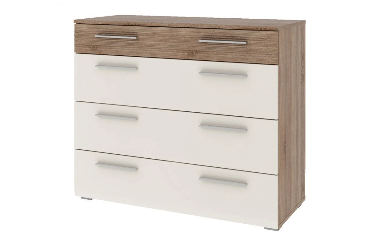 Вместительный комод в красном цветовом исполнении кромок, стильной фурнитурой и 5 выдвижными ящиками.
