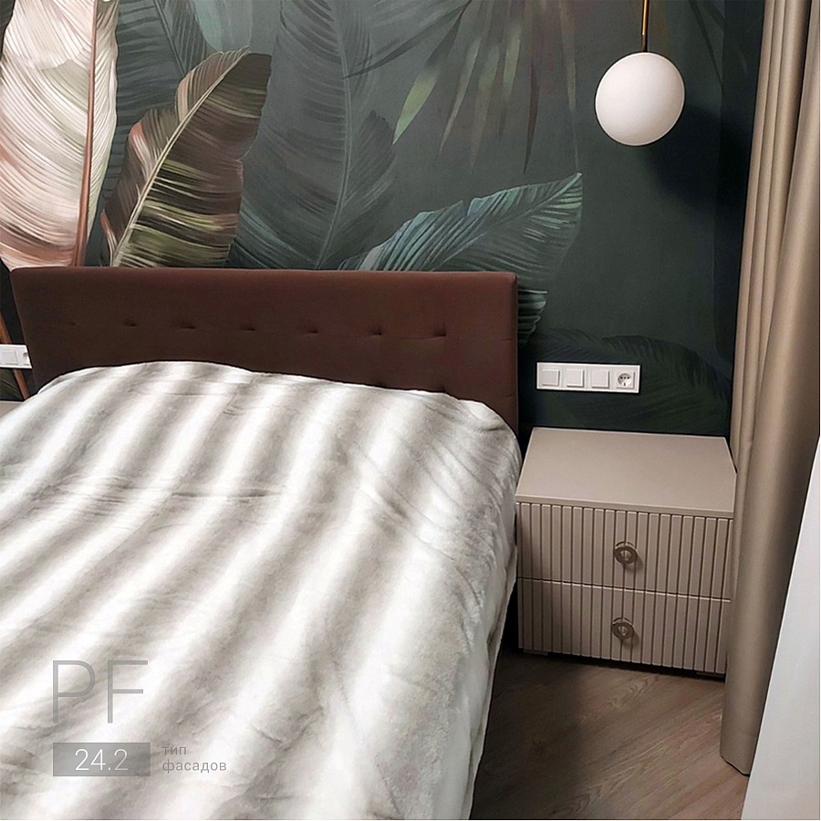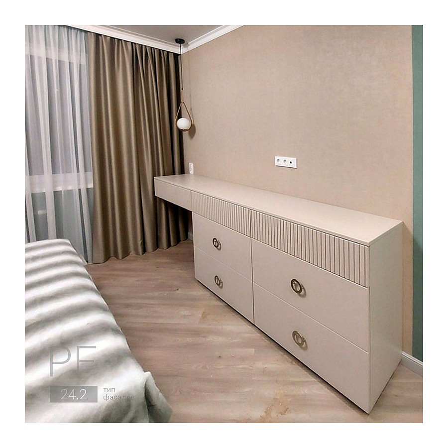 Безупречная фрезеровка в топовой модели фасадов 24.2 идеально вписалась в интерьер. Материал фасадов этого проекта - крашеный МДФ. Из этого же материала сделаны видимые элементы корпуса – боковины, крышки. Цвет подобран по палитре NCS – 2005Y 50R, матовый вид покрытия с этим оттенком создает эффект бархатного легкого перламутра. Системы выдвижения Blum гарантированно подарят идеальное использование этой мебели по назначению на весь срок эксплуатации.