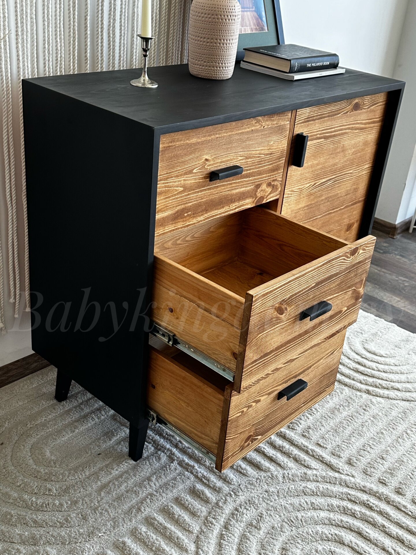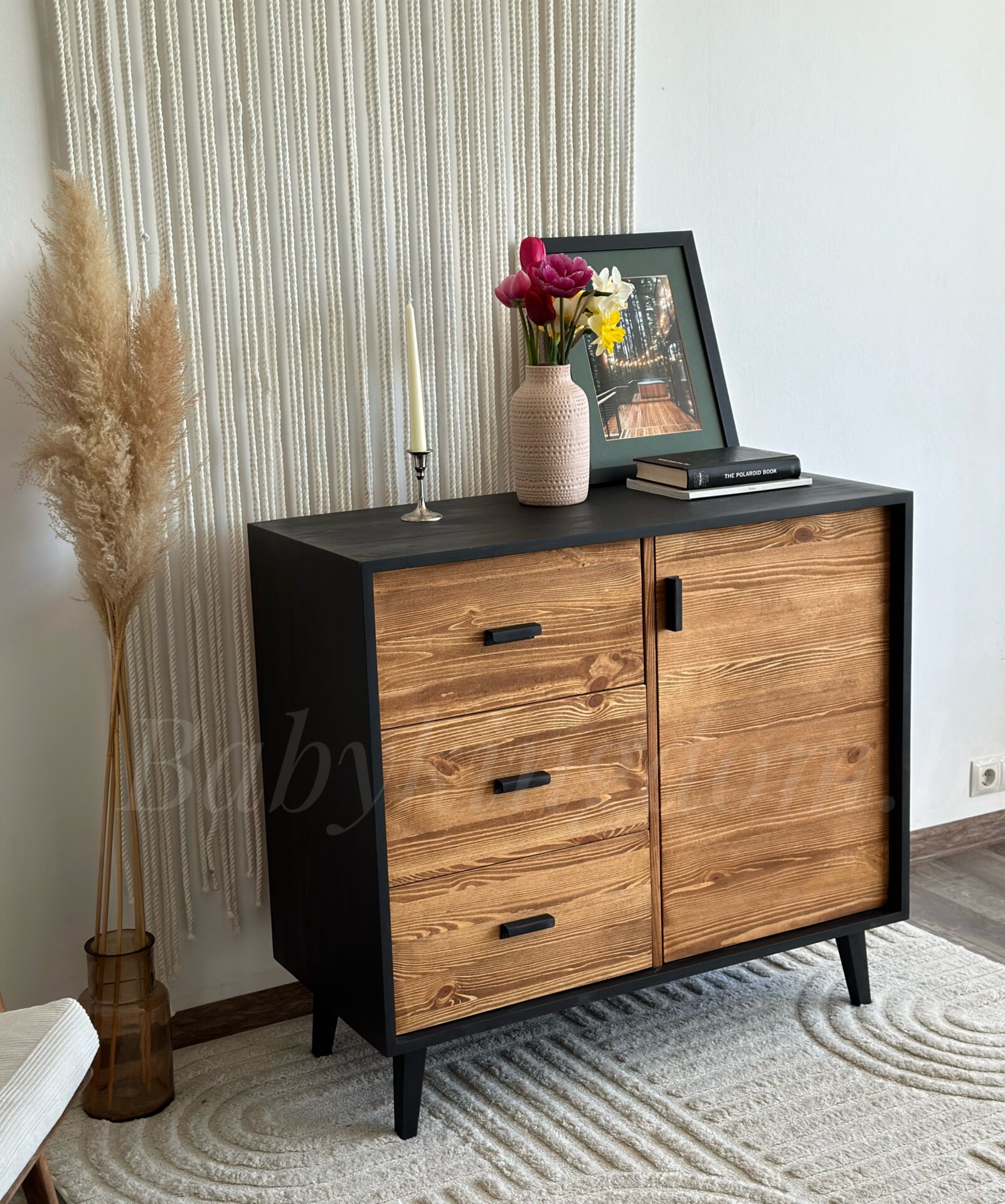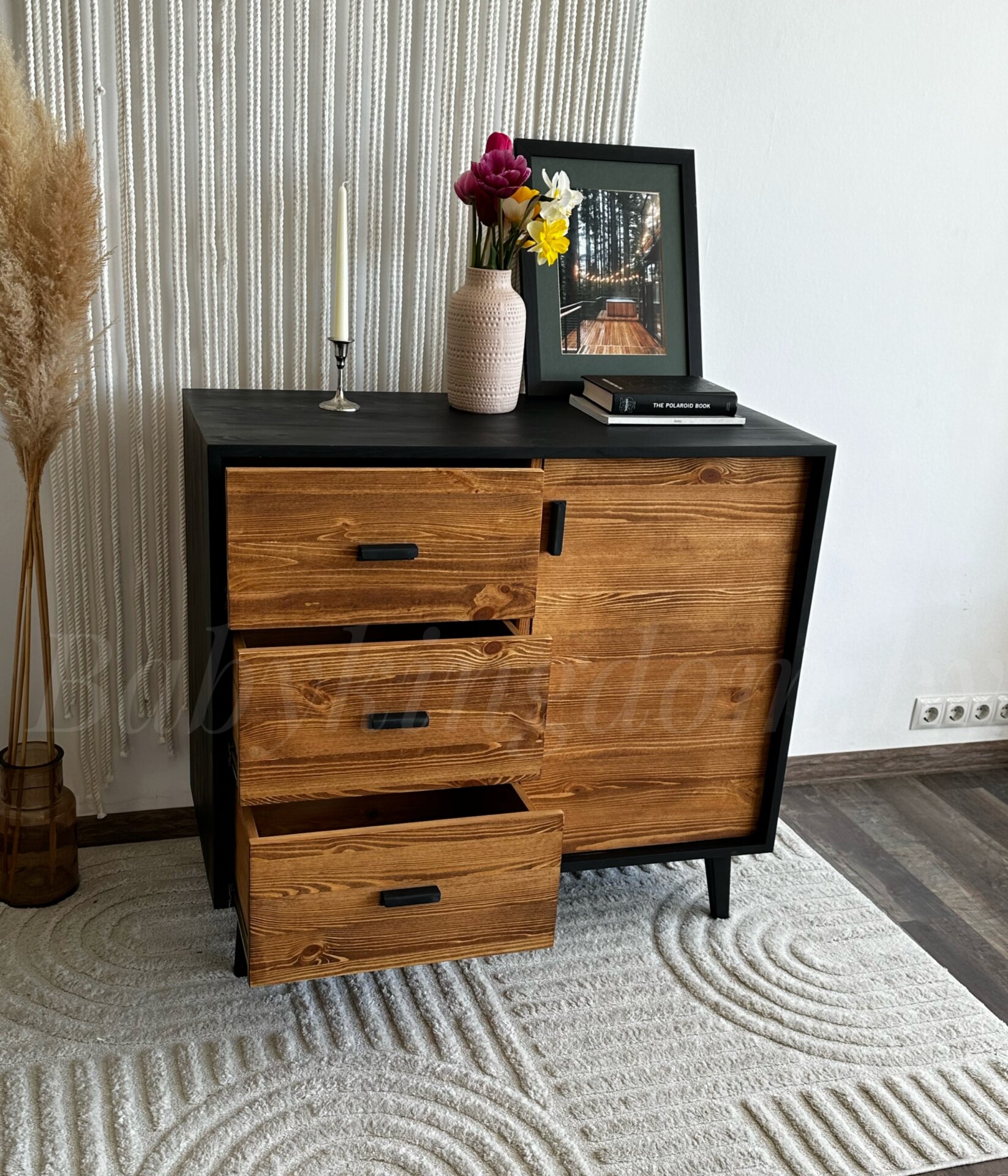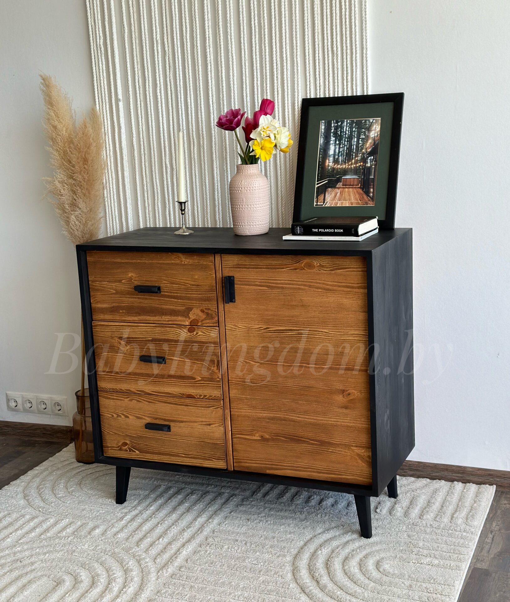 Комод с 4-мя выдвижными ящиками на шариковых направляющих и отделением с дверцей.