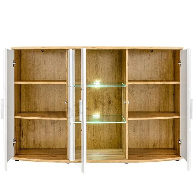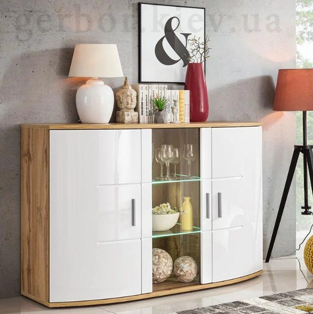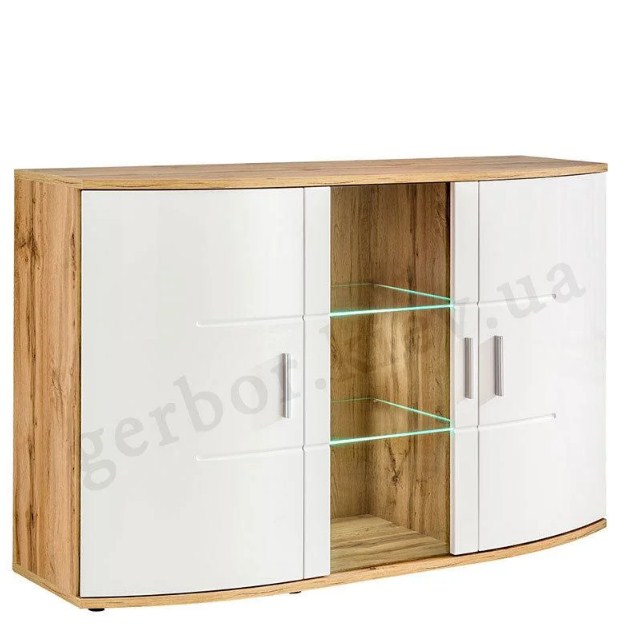 код 105497Корпус - ламинированной ДС 16 мм в цвете дуб вотан, фасад – МДФ, ПВХ белый глянец.