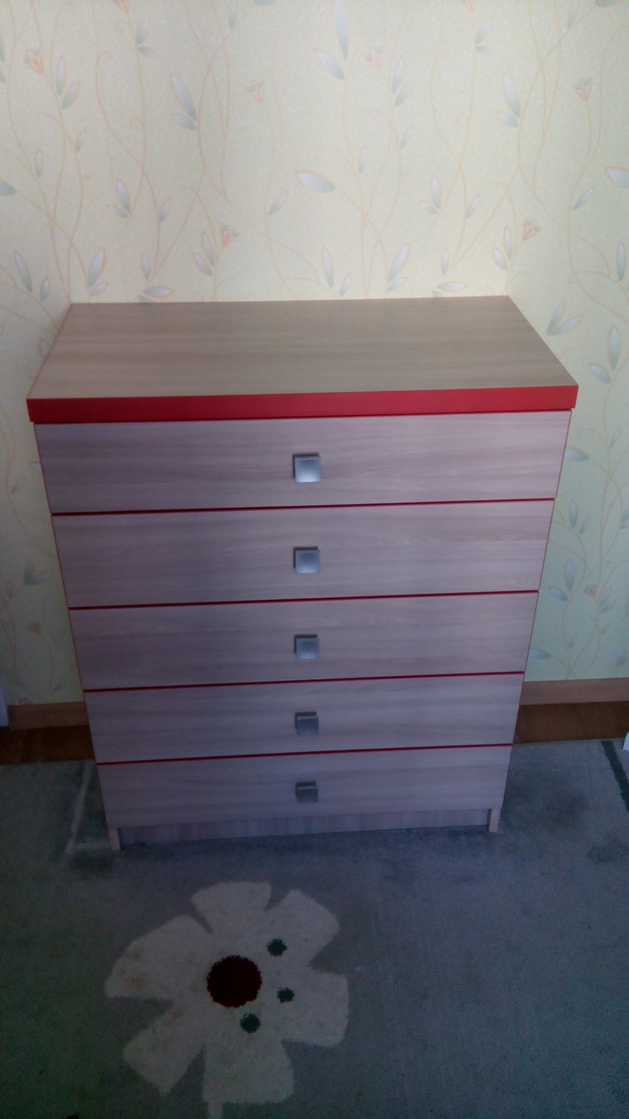 код 92661Вместительный комод в красном цветовом исполнении кромок, стильной фурнитурой и 5 выдвижными ящиками.