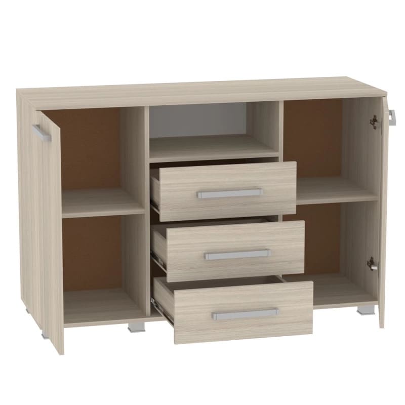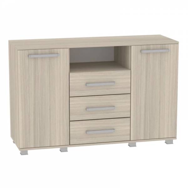 Светлый комод из ЛДСП, два закрытых отдела с полками по бокам.