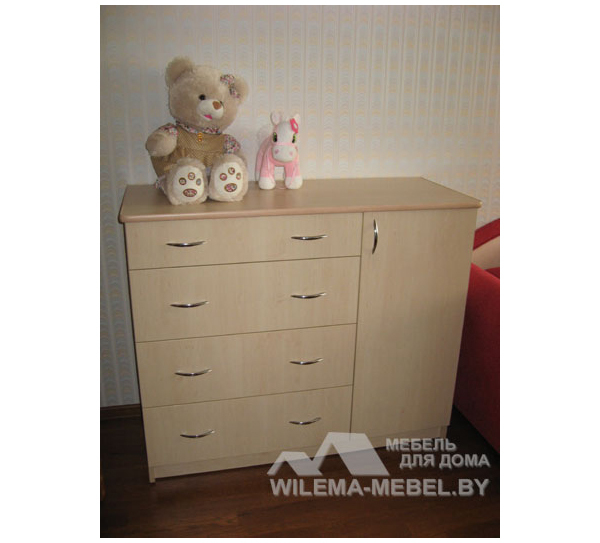 Компактный комод К5 изготовлен из прочного и надежного ламинированного ДСП и способен прослужить долгое время. В модели воплощены несколько крупных и мелкий выдвижной ящик с элегантными ручками. Имеется вместительный шкафчик с вертикальной дверкой. Гладкая столешница имеет закругленные углы.