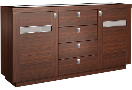 Представленный комод выполнен в темном цвете каштана. Фасад конструкции украшен небольшими ручками, придающими модели современный внешний вид. Модель оснащена четырьмя выдвижными ящиками и двумя распашными шкафчиками по бокам.