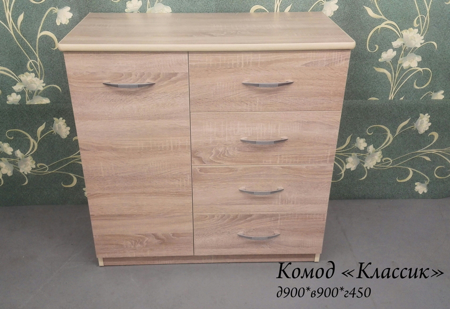 Комод «Классик» оснащен четырьмя выдвижными ящиками и одним распашным. Фасады снабжены надежными металлическими ручками. Качественные материалы изготовления обуславливают долговечность мебели.