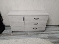 Комод из ДСП в светло-коричневом цвете с древесной фактурой. Полка и три ящика.