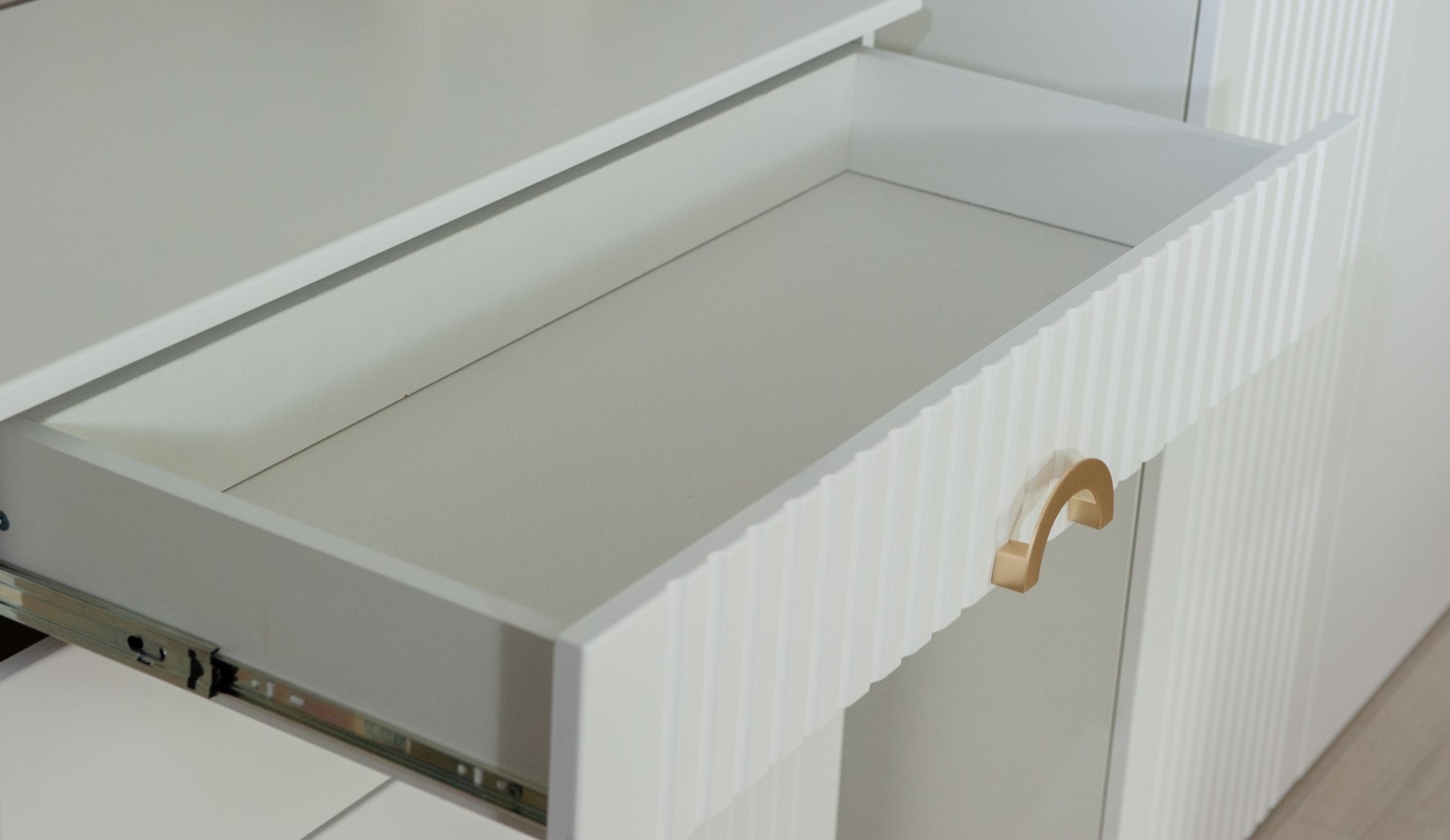 Ширина – 110 см. Комод имеет три выдвижных ящика и два закрытых отделения.