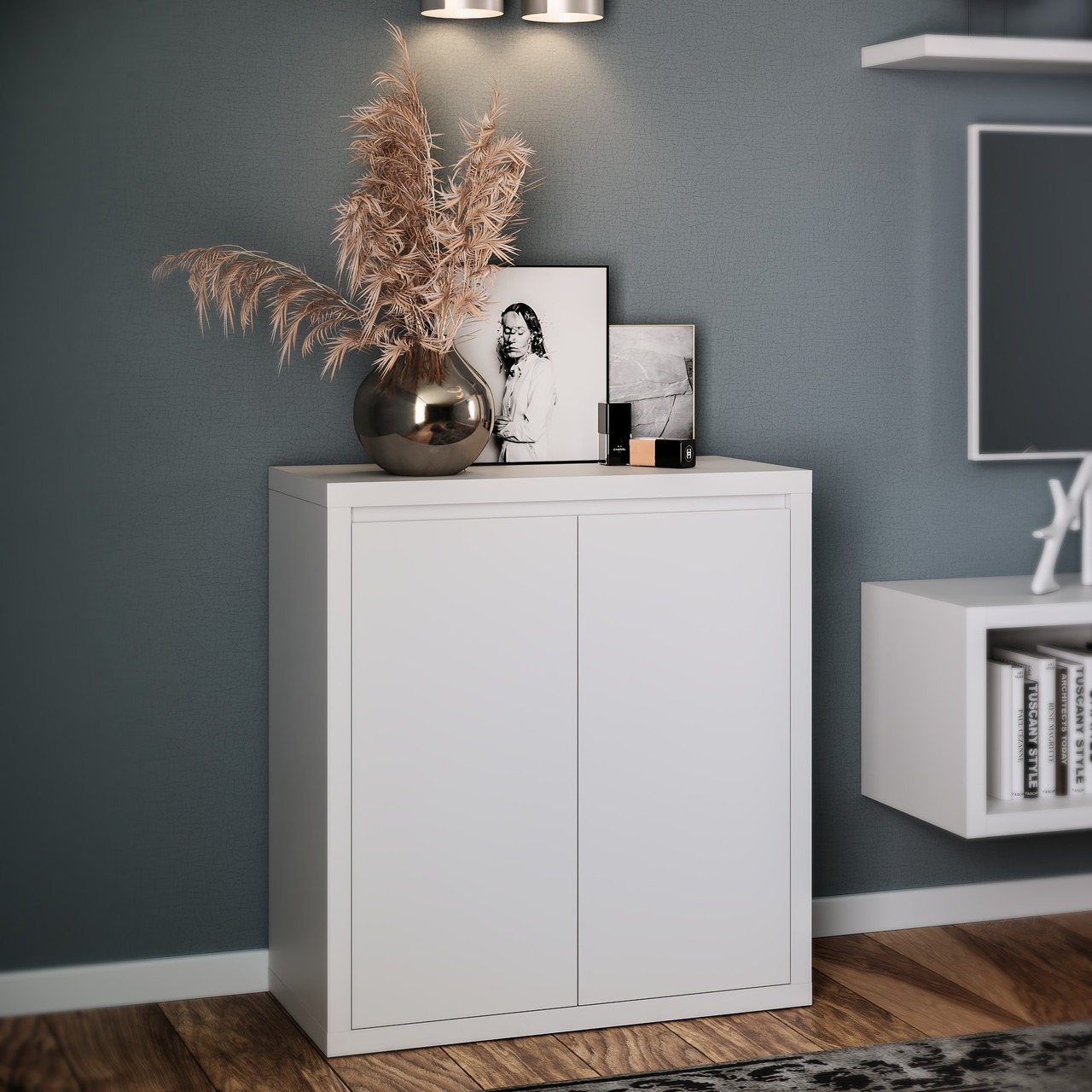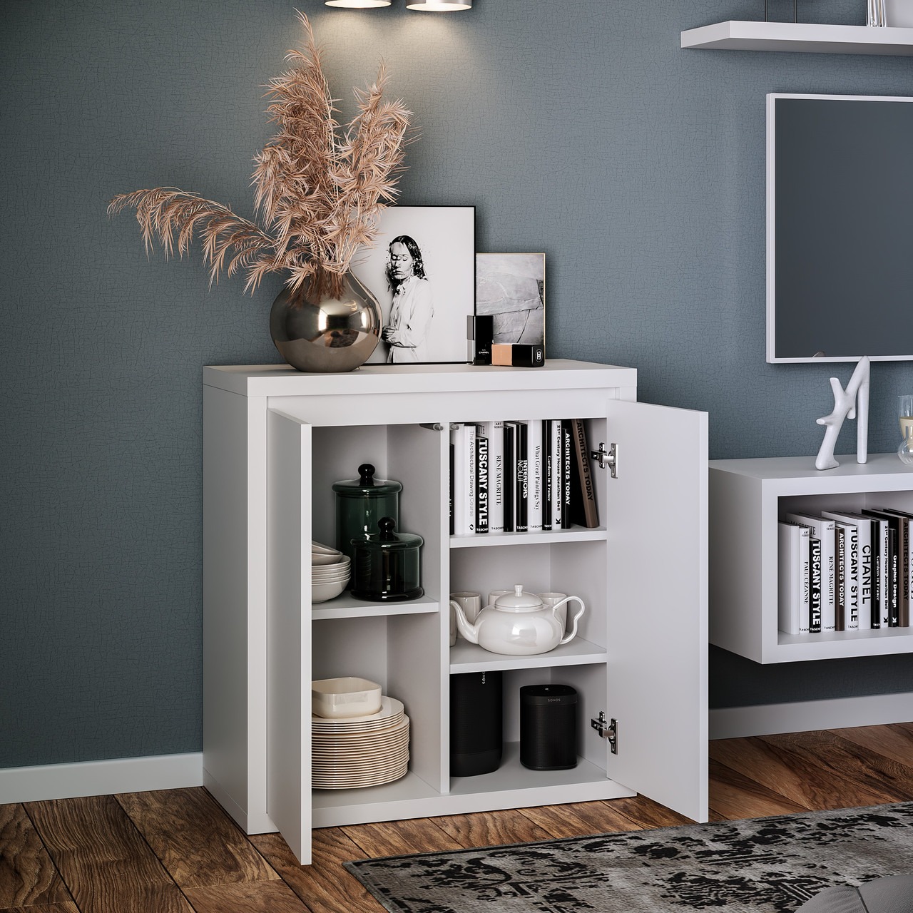 Комод занимает угол в комнате. Открытые полки по сторонам.