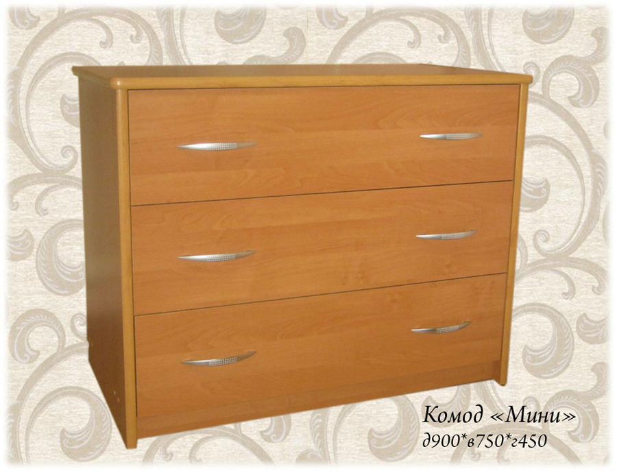 Комод «Мини» оснащен тремя выдвижными ящиками на бесшумных направляющих. Вместительный объем позволяет хранить большое количество вещей. При изготовлении используются только качественные и долговечные материалы.