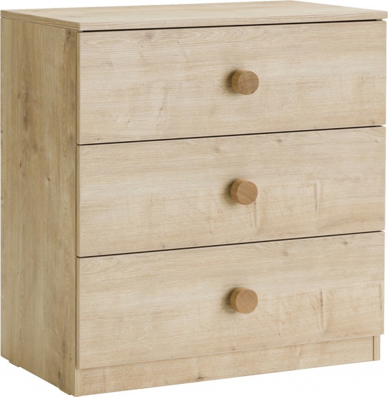 Мебель в древесном окрасе изготовлена в прямой форме. Она состоит из трех ящиков выдвижного типа. Фурнитуре характерно цилиндрическое исполнение.