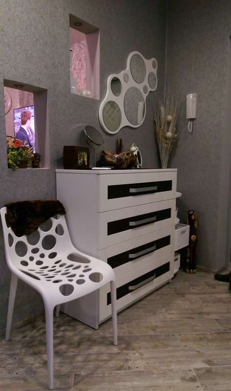 Небольшой комод может стать хорошим помощником в прихожей. Модель исполнена в белоснежно белом цвете и оснащена двумя выдвижными ящиками с черными вставками.