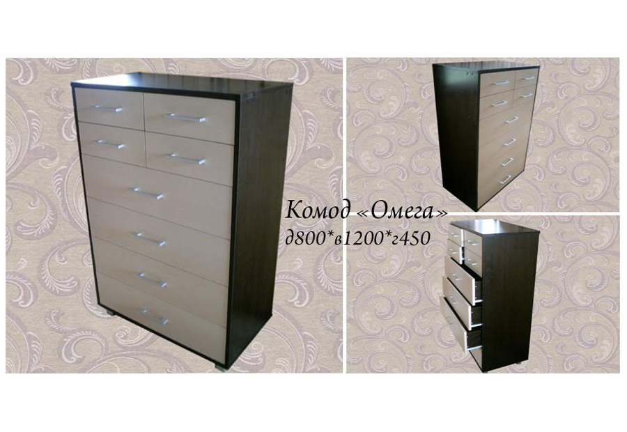 Комод «Омега» включает в себя множество выдвижных ящиков и станет отличным местом для хранения мелких принадлежностей. Модель изготовлена из ЛДСП, каркас окрашен в цвет венге, фасады – в беленый дуб. Ящики комплектуются надежными металлическими ручками.