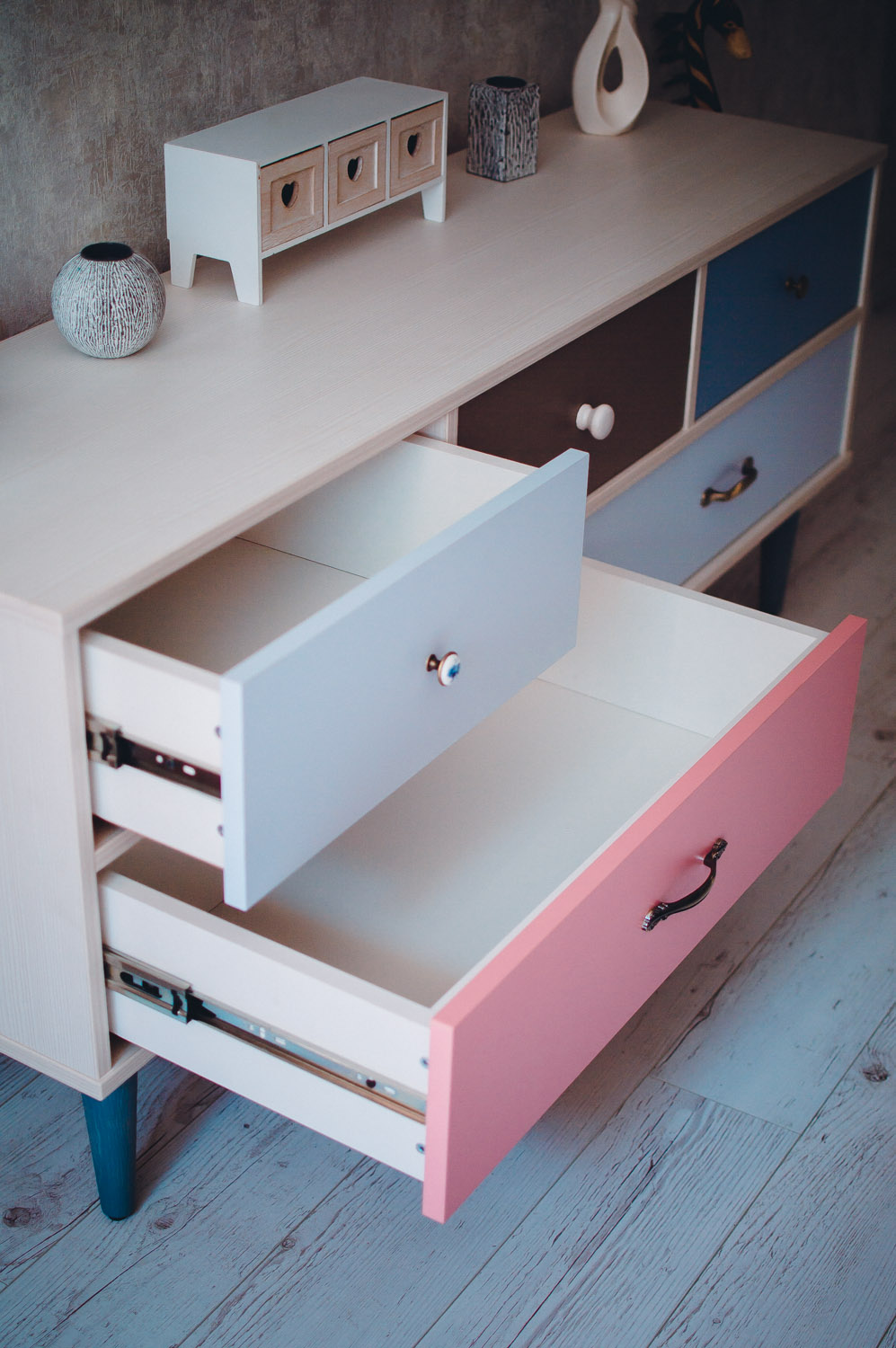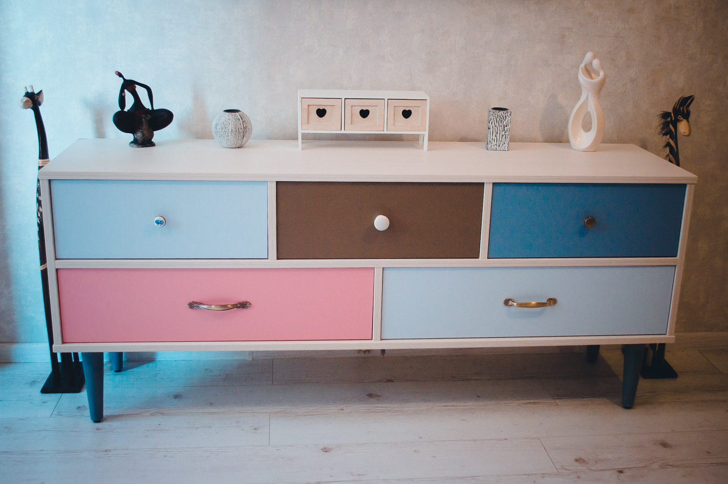 Оригинальный декор комода «Ретро 2Р» добавит интерьеру комнаты ярких красок. Все фасады ящиков окрашены в разные цвета и оснащены самыми разнообразными ручками. На пол модель устанавливается при помощи высоких деревянных ножек. Функциональный комод может использоваться как тумба под ТВ.
