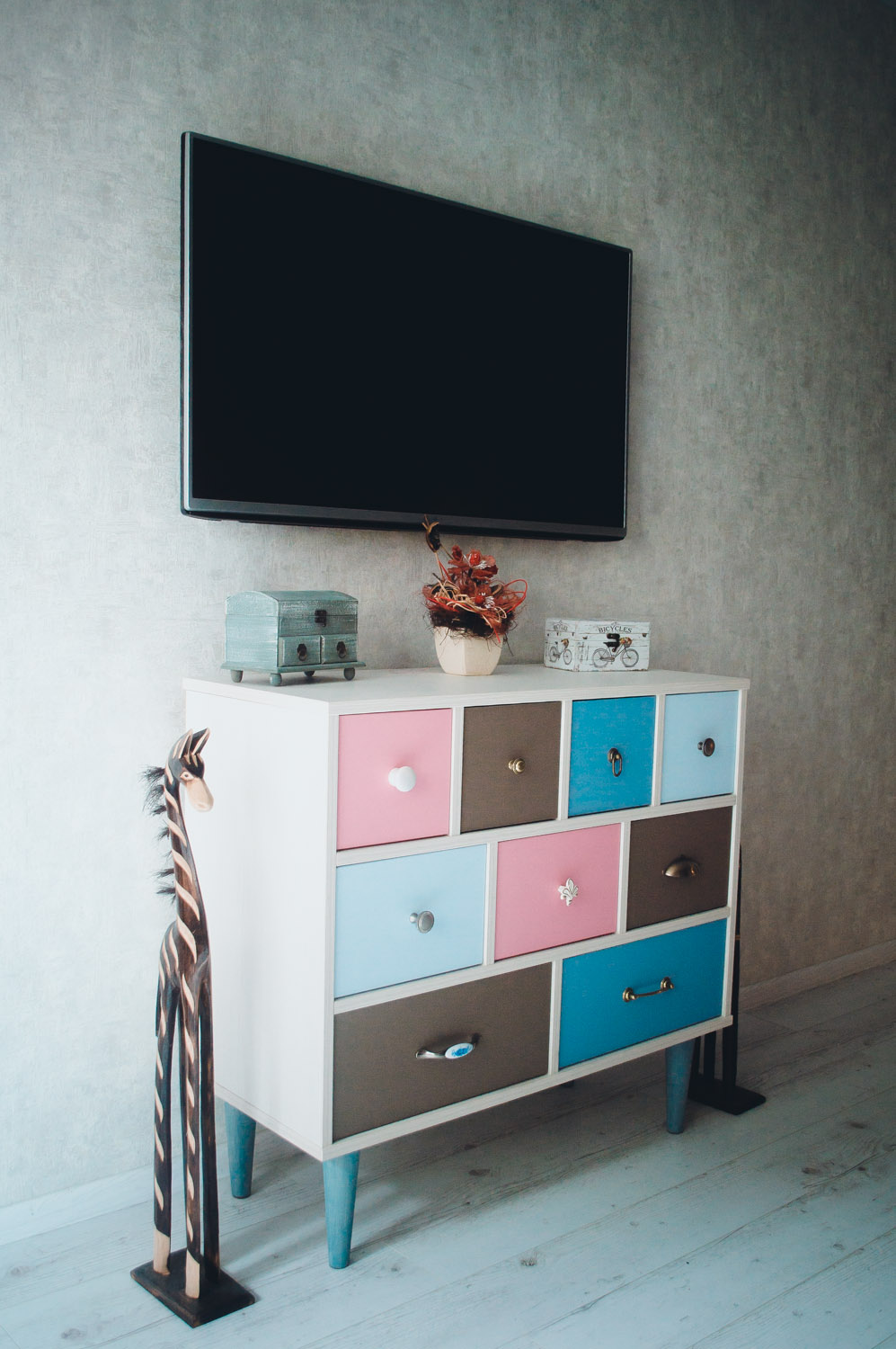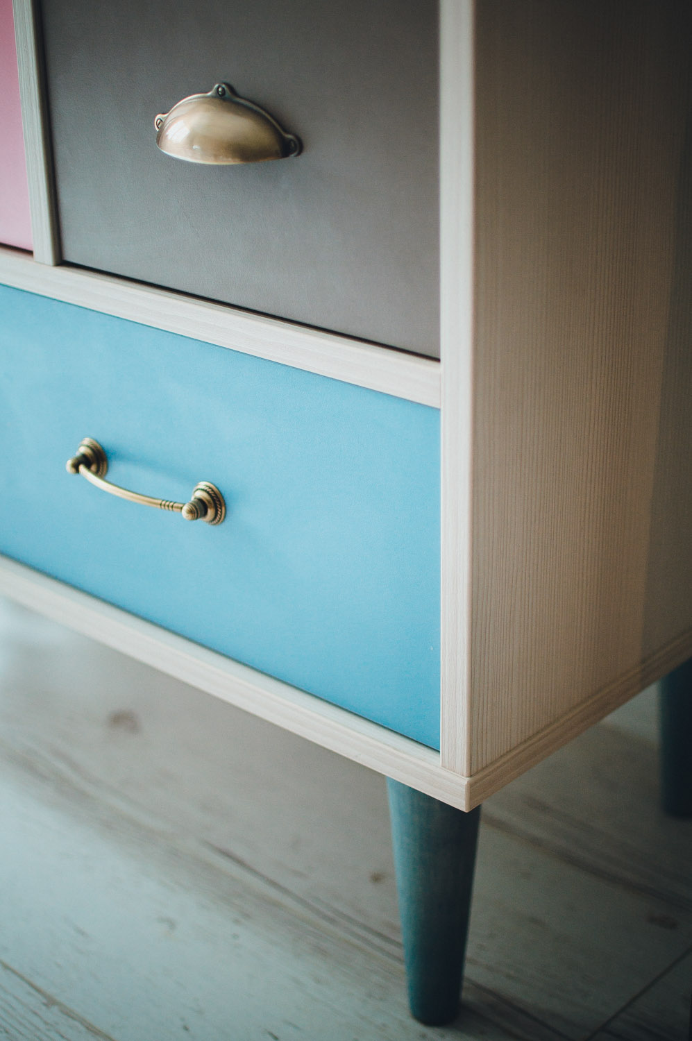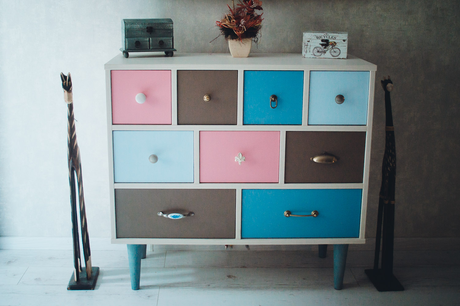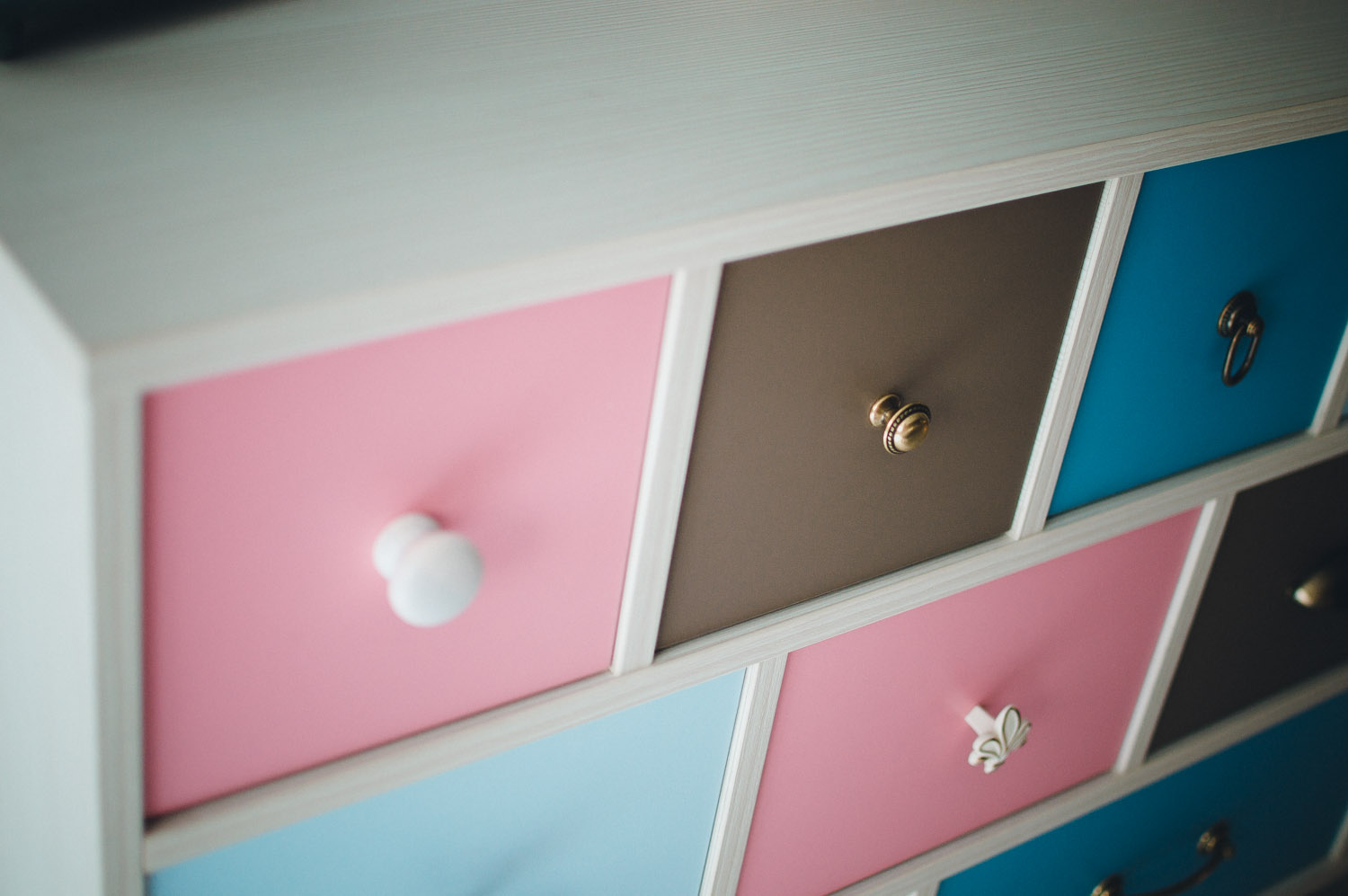 Ящики в комоде «Ретро 3Р» расположены в три ряда, организуя интересную композицию. Выдвижные ящики в каждом ряду имеют разный размер и ручки самых интересных форм. Светлая текстура корпуса великолепно сочетается с разноцветным декором ящиков. Яркий и креативный дизайн комода придется по вкусу любителям неординарных решений для оформления интерьера комнаты.