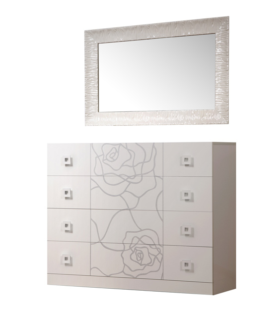 Комод «Роза» идет в комплекте вместе с зеркалом. Одной из его особенностей являются оригинальные квадратные ручки. Фасад модели декорирован цветочным узором.