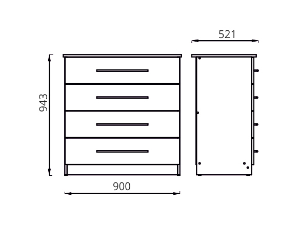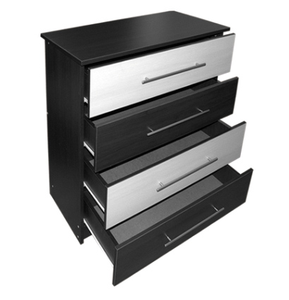 Комбинированные фасады комода выполнена в двух цветах. Модель изготовлена из высококачественной ламинированной ДСП. Фасады дополнена удлиненной хромированной фурнитурой, расположенной в горизонтальном направлении. Четыре выдвижных ящика оснащены доводчиками, обеспечивающими плавное открывание и закрывание.