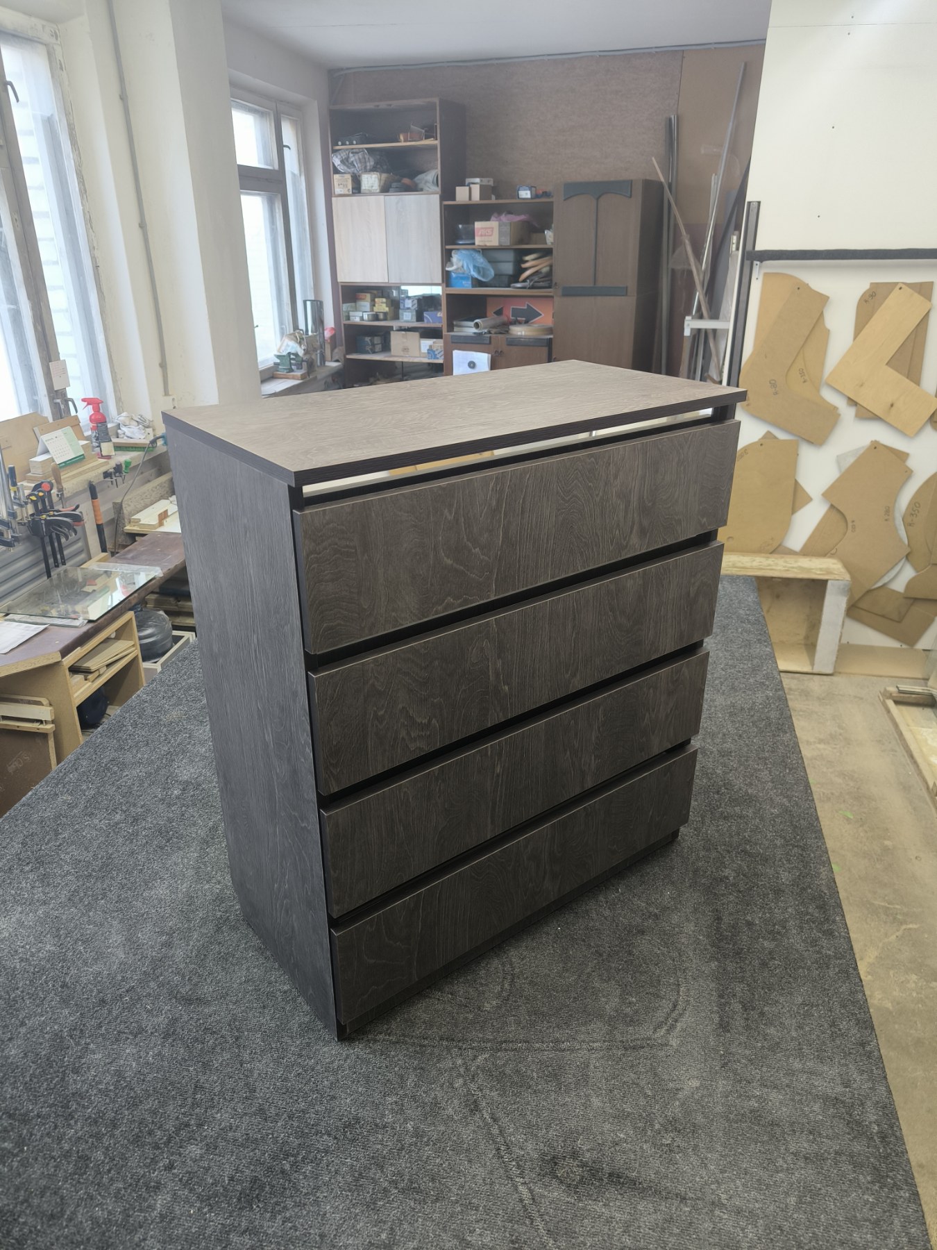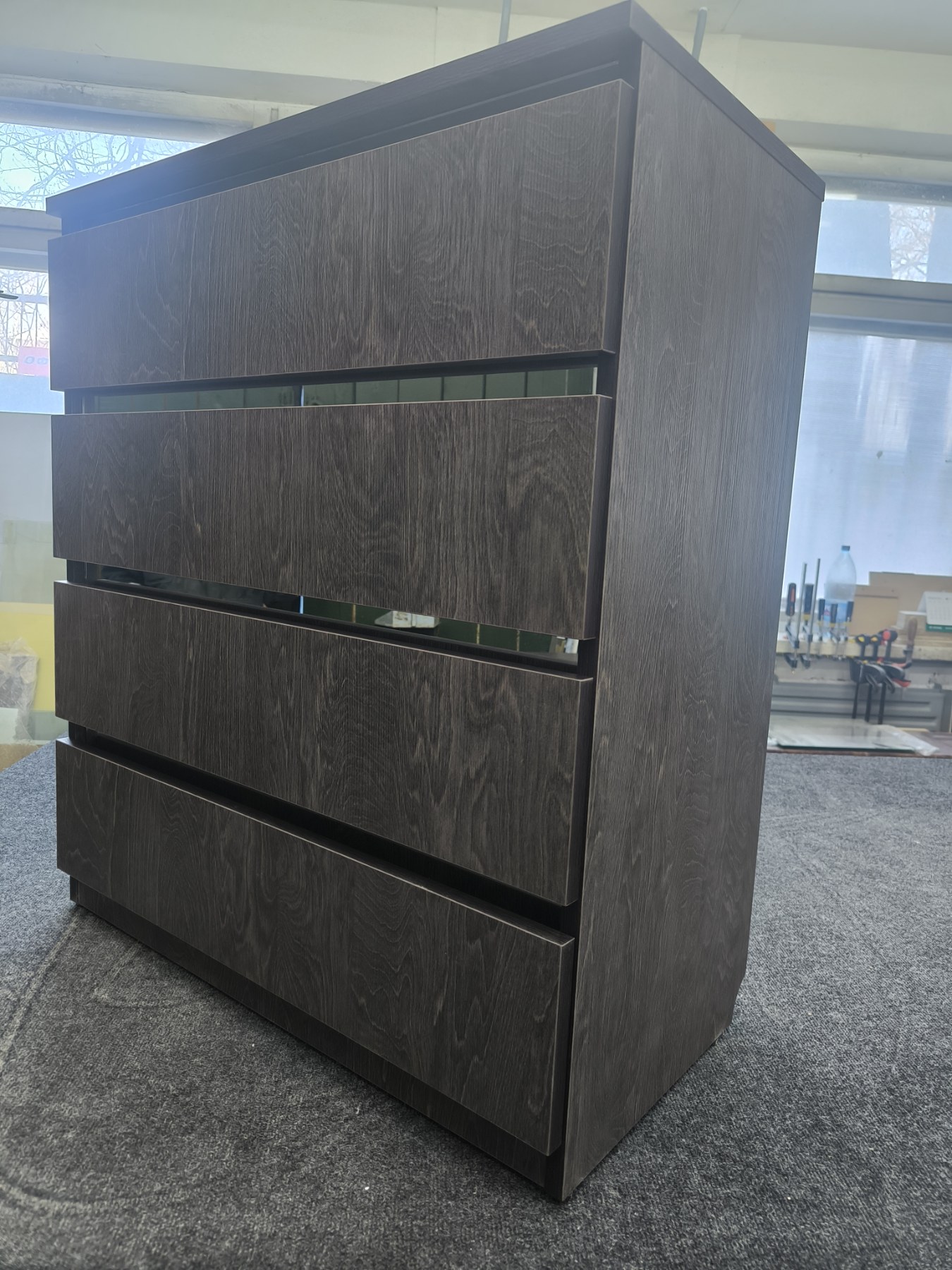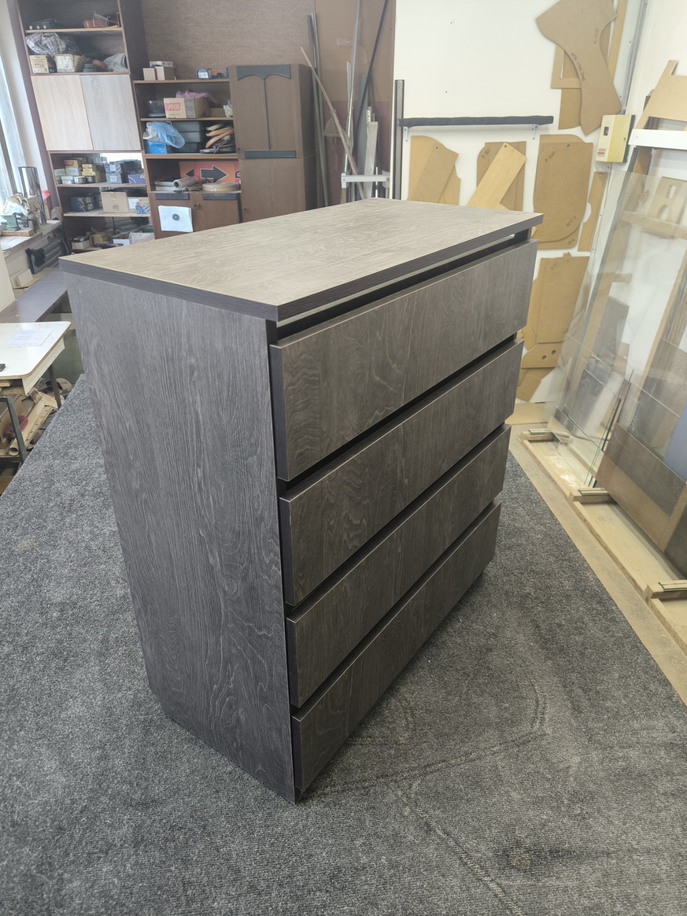 Комод с декором дуба в сером цвете. Конструкция из ЛДСП, шариковые направляющие.