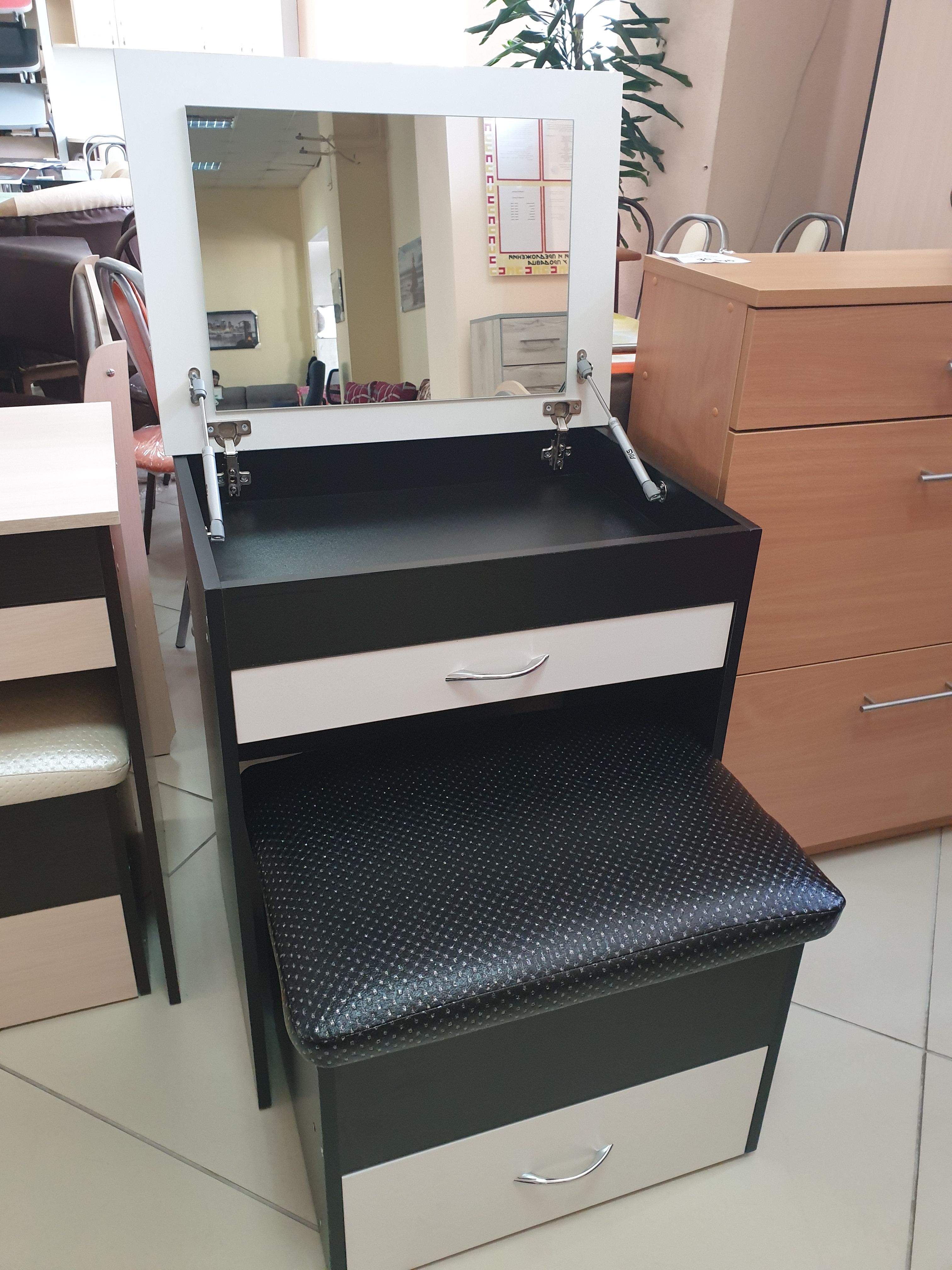 Ширина – 110 см. Комод имеет три выдвижных ящика и два закрытых отделения.