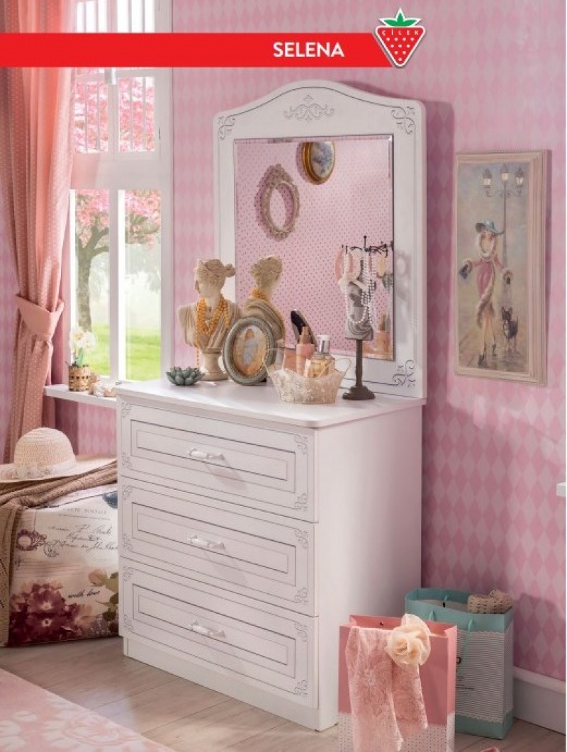 Классический комод белого цвета украсит детскую, спальню или жилую комнату в соответствующем стиле. Фасады украшены декоративной резьбой и изящными белыми ручками. Три больших выдвижных ящика подойдут для хранения одежды, косметики, книг или полезных мелочей.