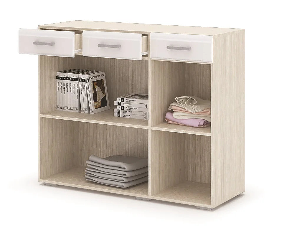 Шесть вместительных квадратных полок и три выдвижных полки.