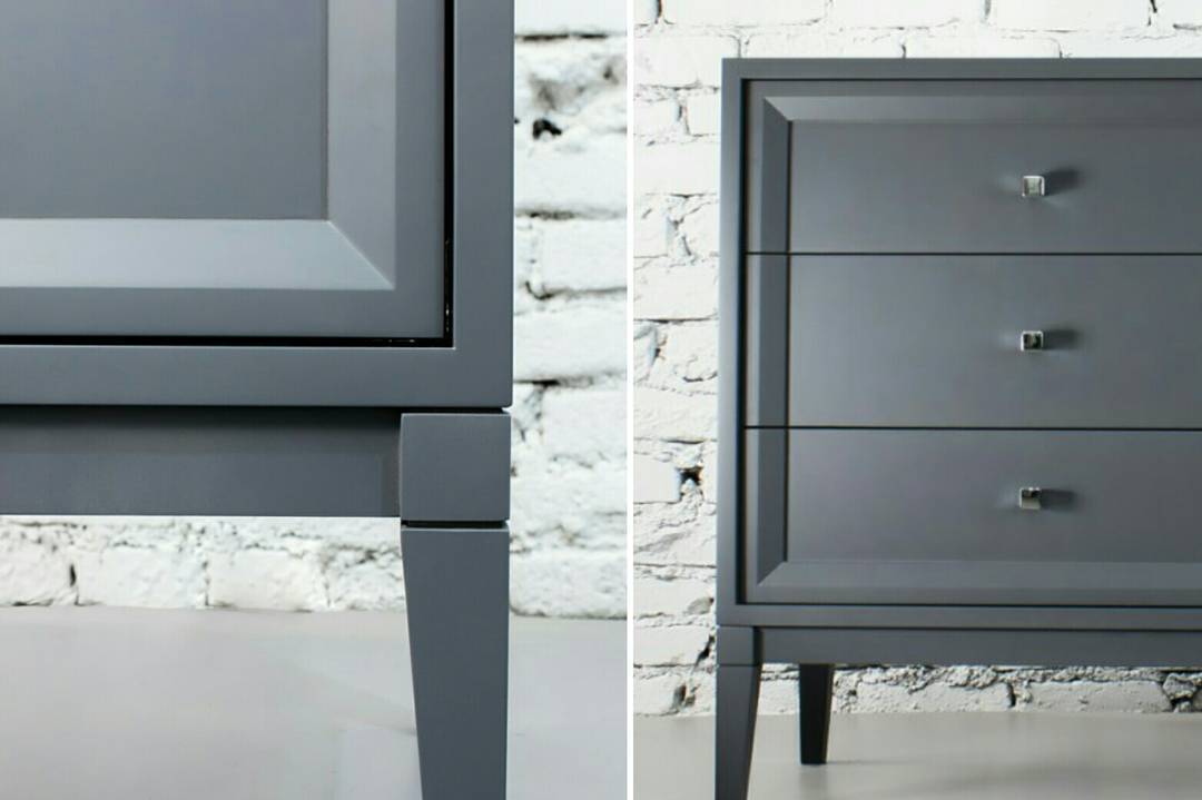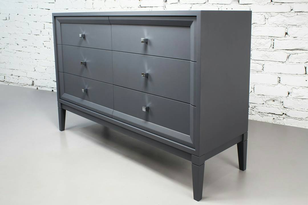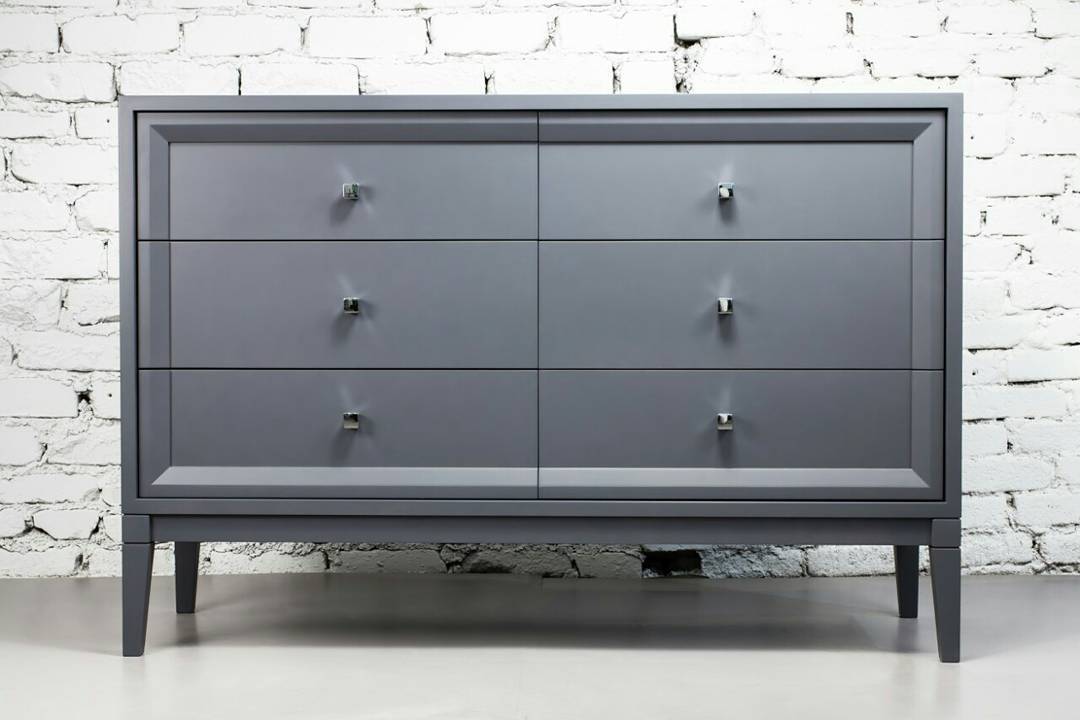 Крафтовый комод «СлейтГрей» для интерьера спальни в наличии от производителя изготовлен в нейтральном сером цвете, доступен для заказа в любых размерах и цветах RAL. Фасад из шести выдвижных ящиков в общей рамке украшен хромированными квадратными ручками-кнопками, буквально светящимися на общем фоне. Следуя канонам современного минимализма, корпус и ножки лаконично дополнены рельефным декором.
