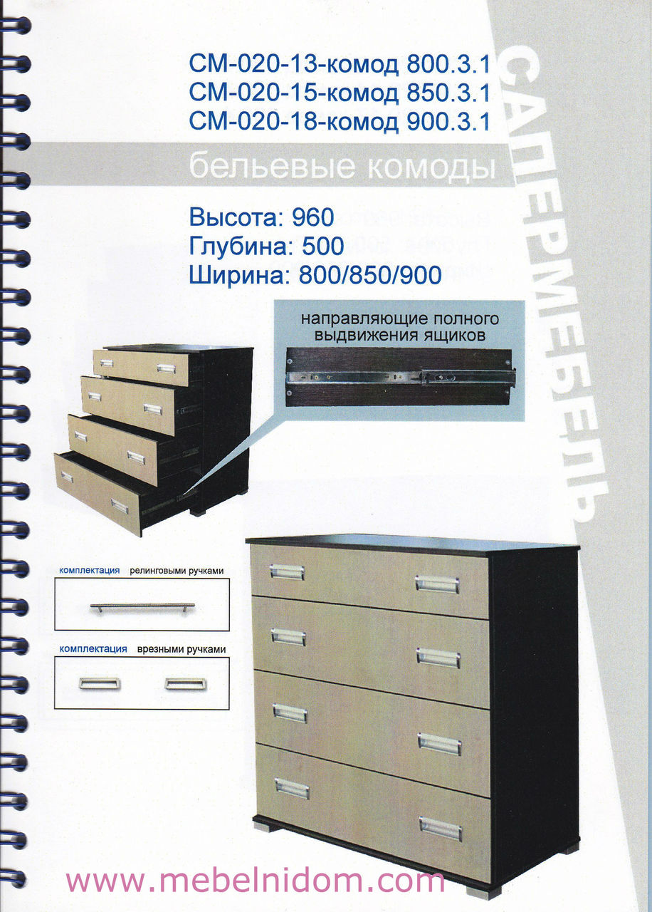 Комод «СМ-020.18» обладает четырьмя выдвижными ящиками. Ручки могут быть релинговыми или врезными. На выбор предлагаются различные варианты цвета. Цена указана за модель 900 мм.