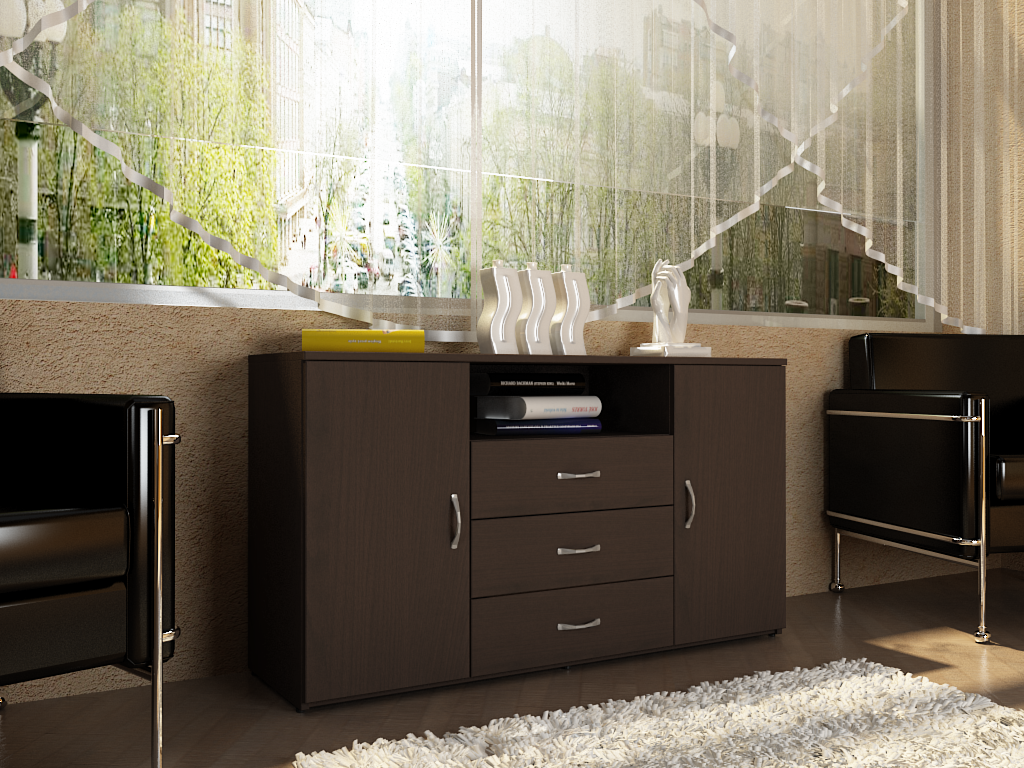 Симметричный широкий комод с двумя закрывающимися отделами по краям и тремя шуфлядами с открытой нишей по центру. На дверцах и выдвижных ящиках округлые хромированные ручки с матовым напылением.