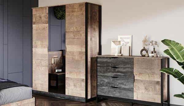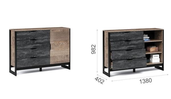 Добавьте штрих индустриальной элегантности в свой интерьер с помощью этого стильного комода. Оснащенный четырьмя выдвижными ящиками и шкафчиком, комод обеспечит вам массу места для хранения вашей одежды, белья и личных вещей.