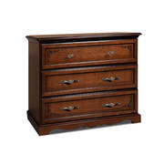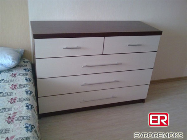 Комод хорошо подойдёт для спальной комнаты, выполнен в светлых тонах, с темной крышкой и стенками.