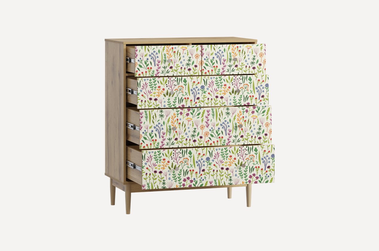 Вместительный комод в красном цветовом исполнении кромок, стильной фурнитурой и 5 выдвижными ящиками.