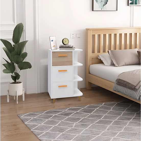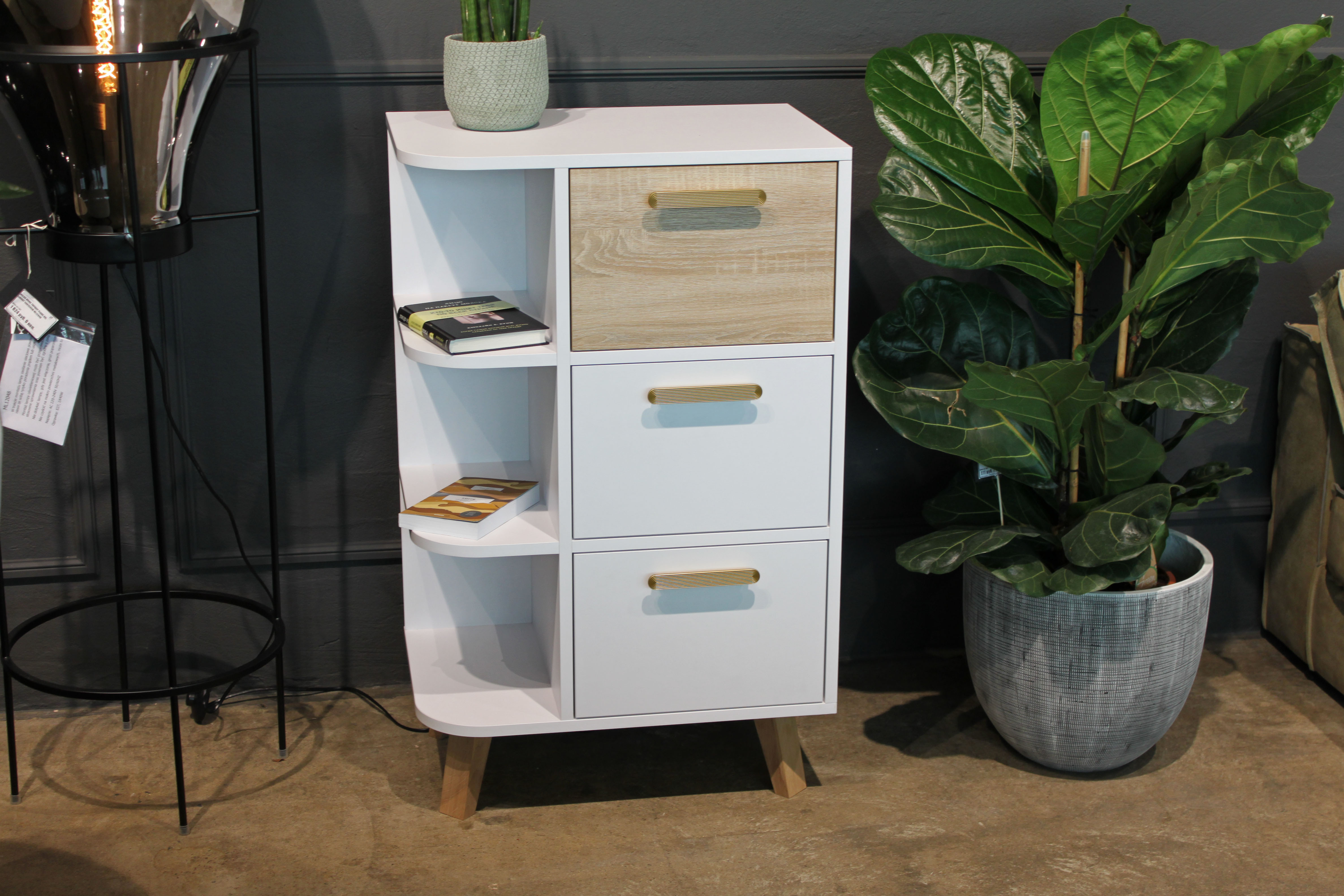 Комод выполнен из высококачественного ЛДСП в цвете «белый бриллиант» и «светлый дуб сонома», а ножки – из натурального дуба.