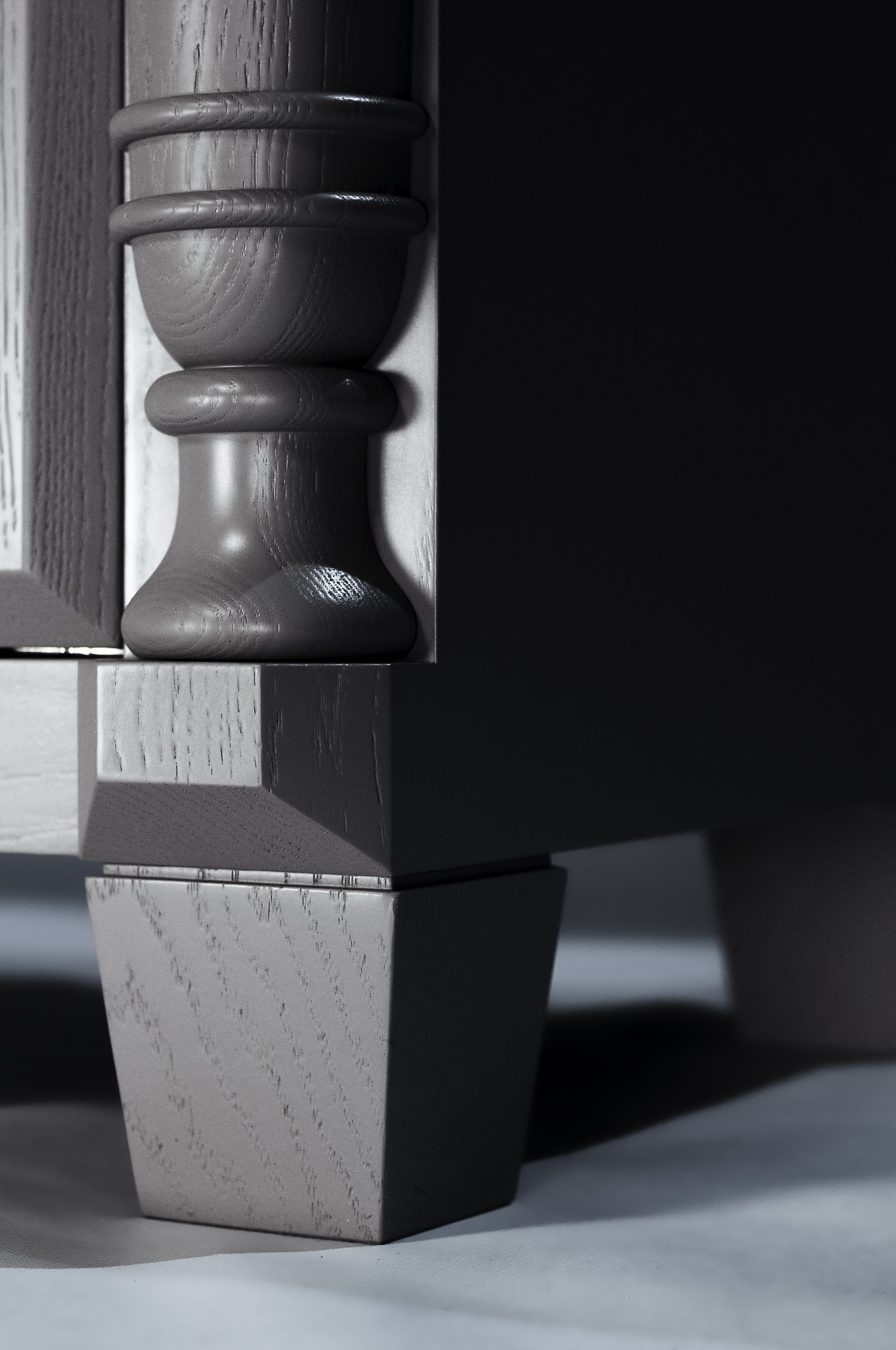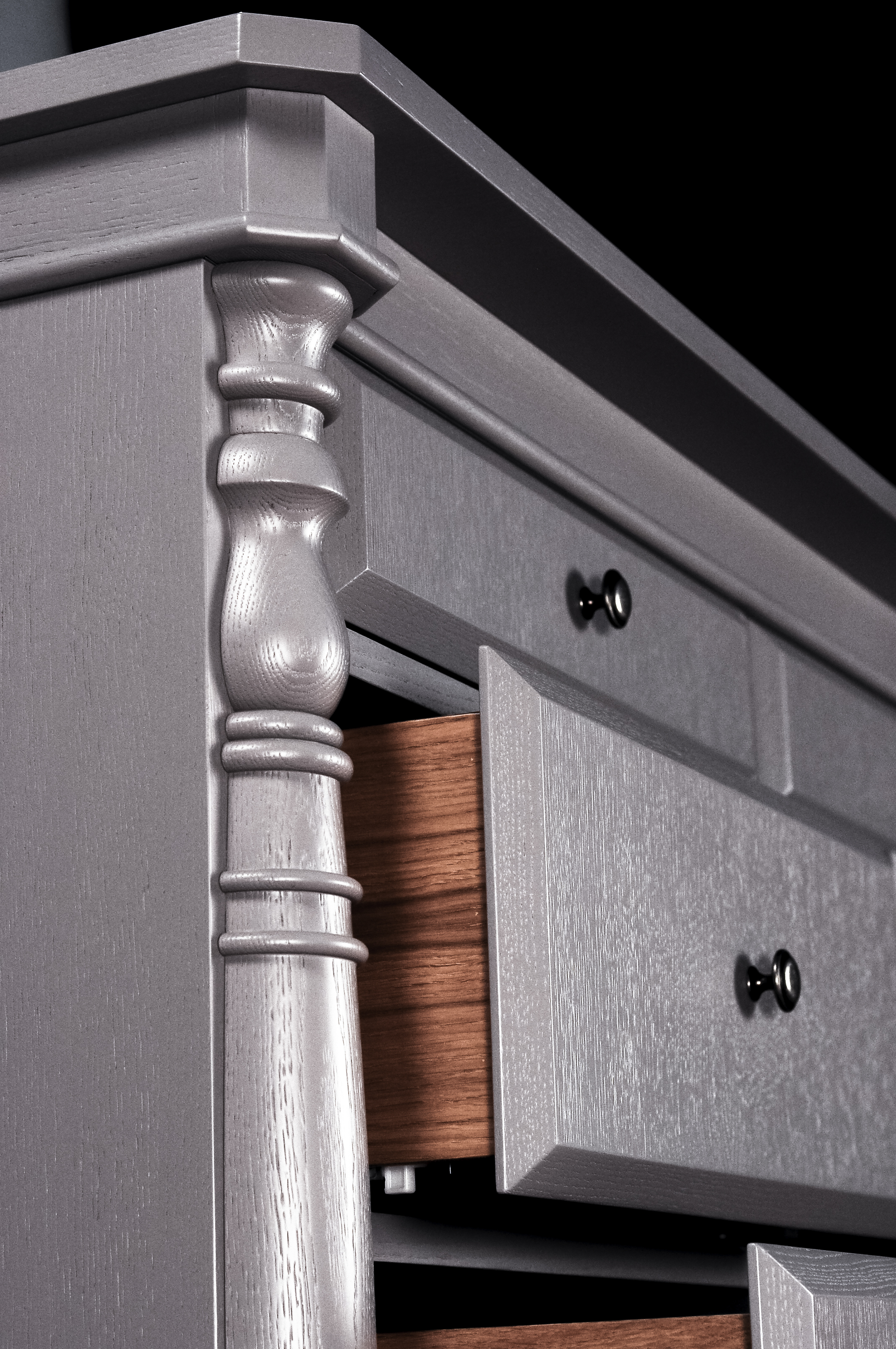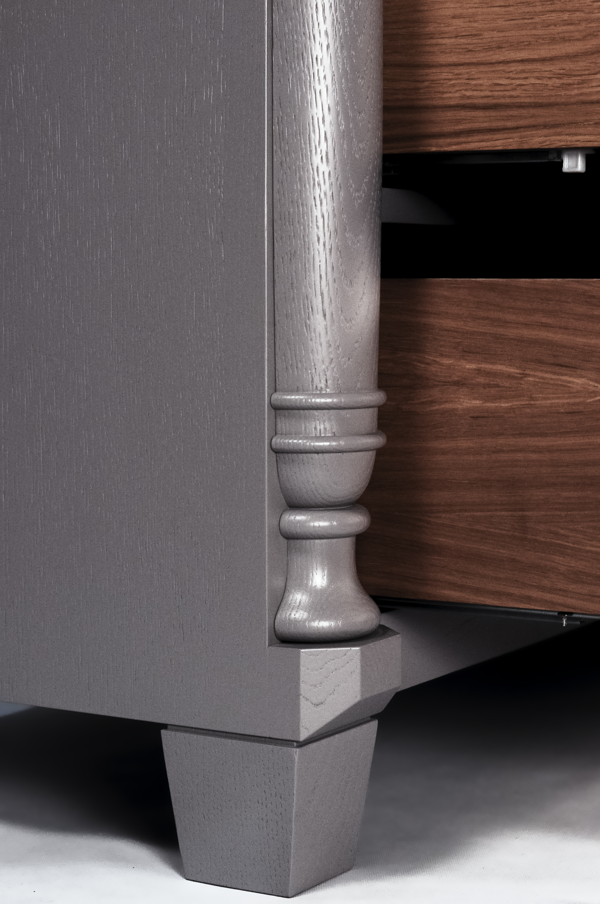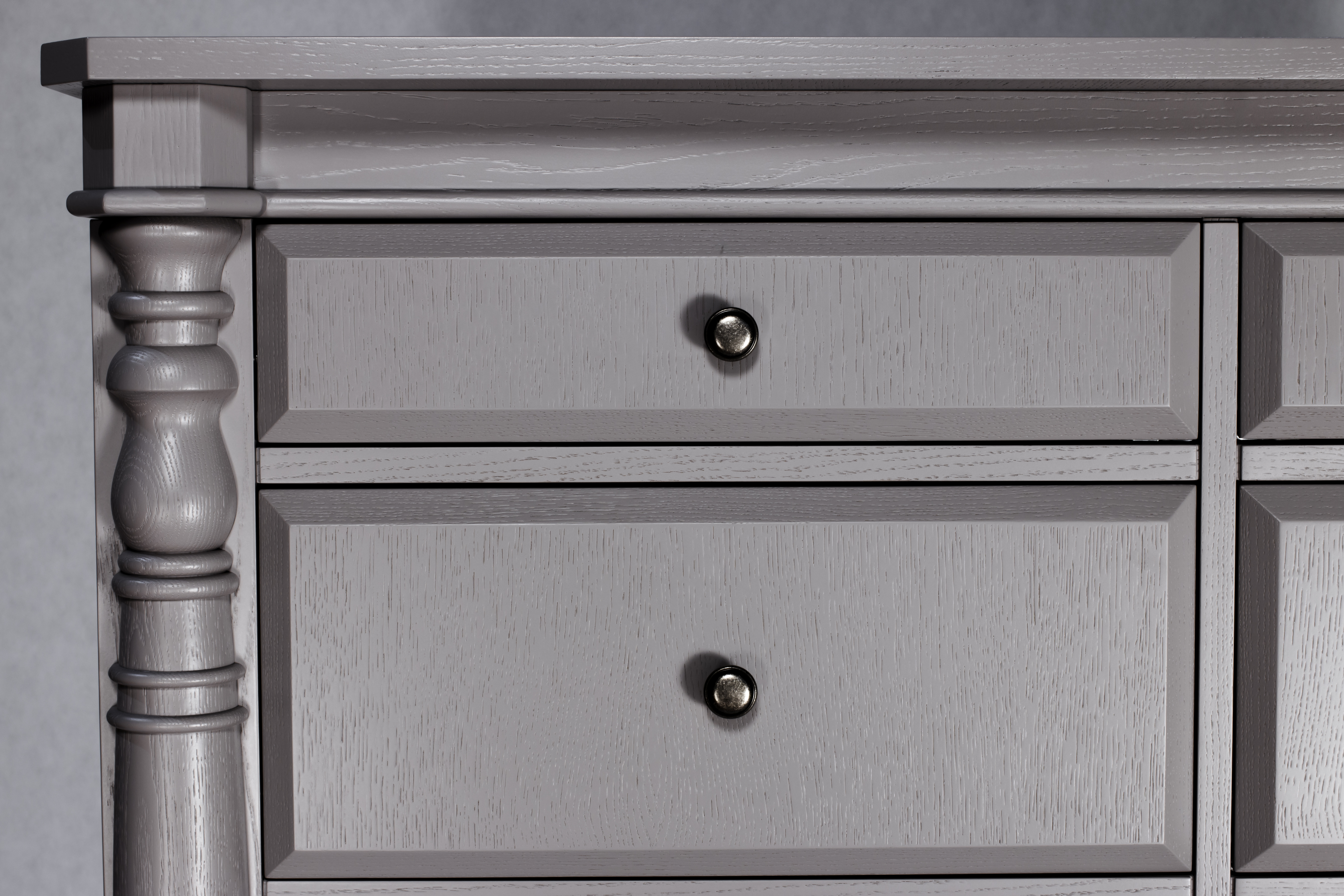 Габаритный комод, выполненный в стильном сером цвете, органично впишется в интерьер гостиной или спальни. По бокам комод декорирован колоннами, которые создают визуальную иллюзию опор модели. Функционал комоды состоит их четырех рядов разноразмерных ящиков, которые бесшумно выдвигаются благодаря современным направляющий Blum.