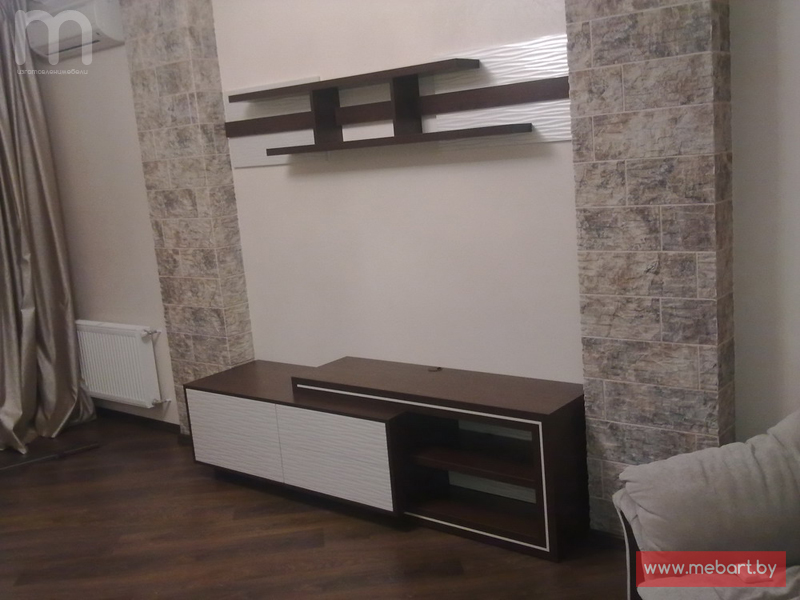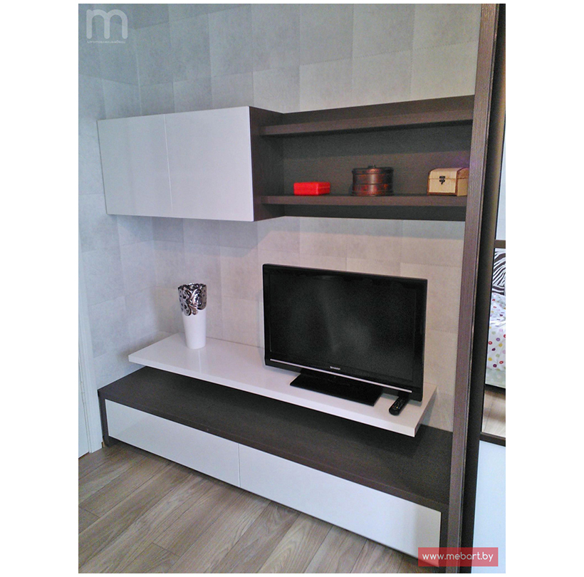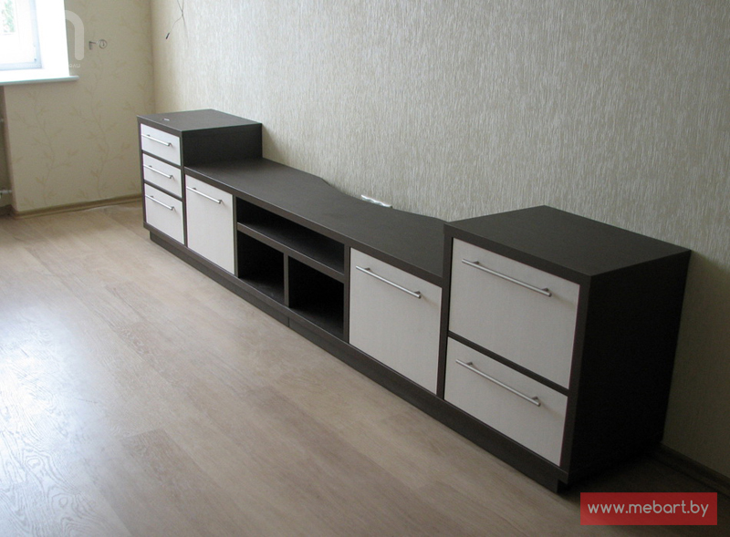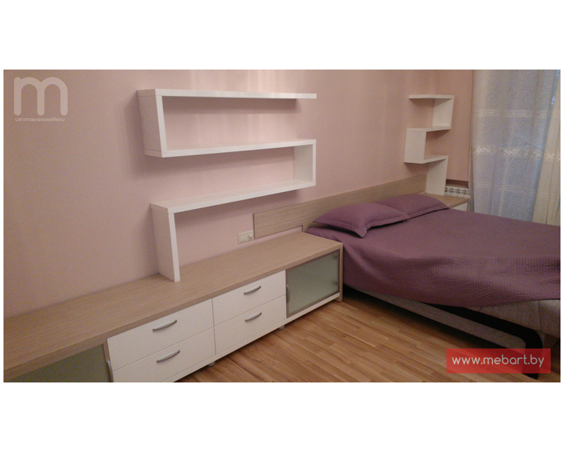 Комод занимает угол в комнате. Открытые полки по сторонам.