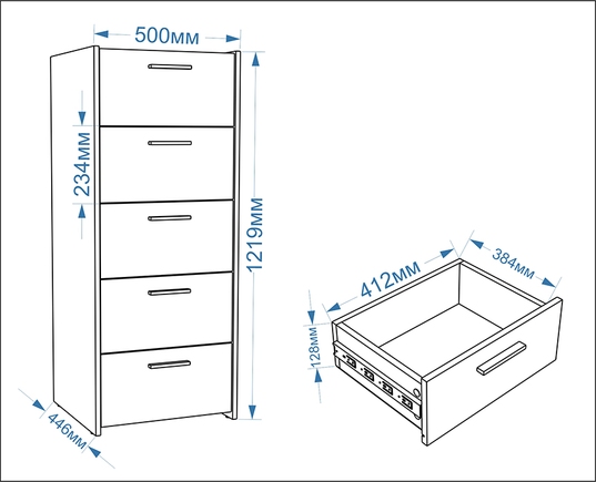 Фурнитура: Направляющие шариковые полного выдвижения, ручка мебельная PS25/C25.