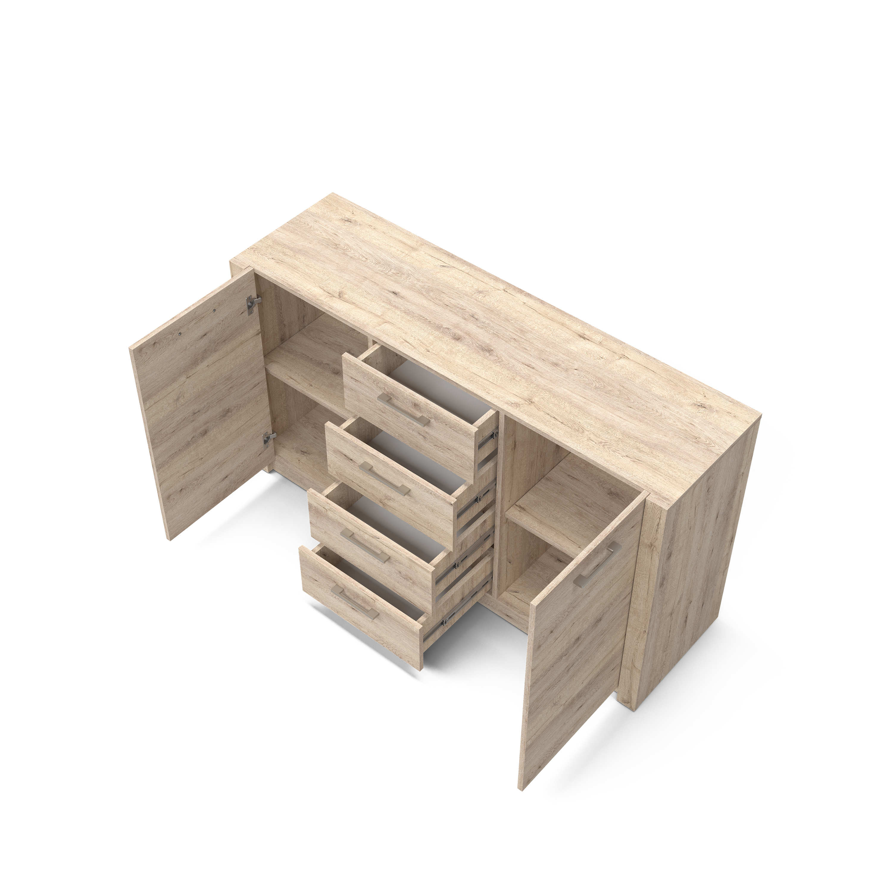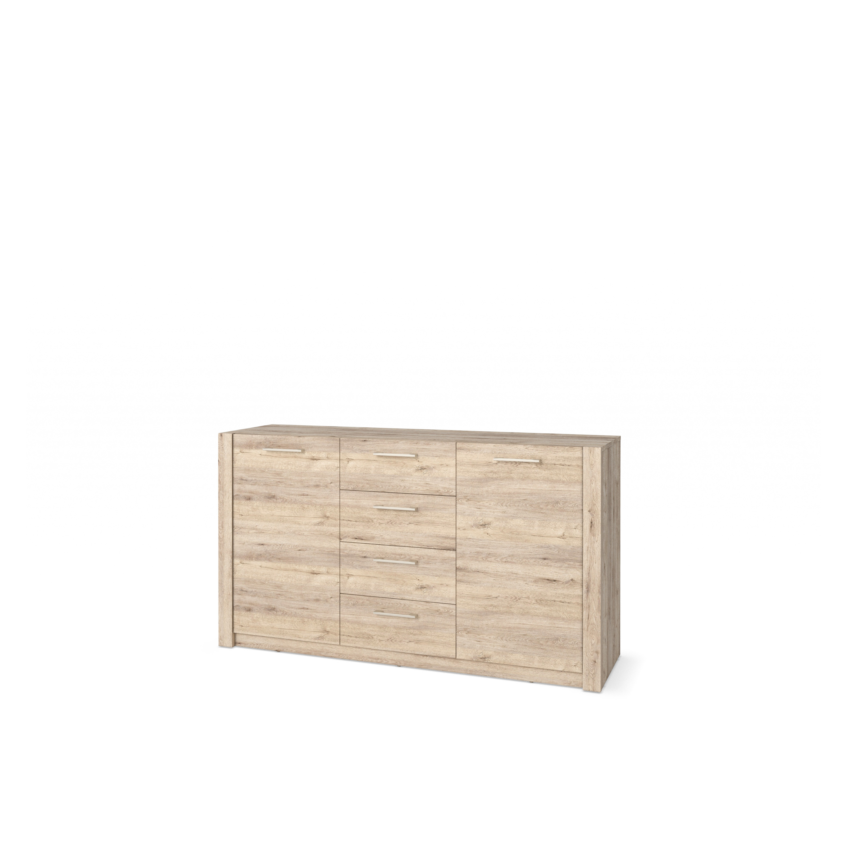 Длинный комод с четырьмя выдвижными ящичками, оснащенными специальными механизмами, которые позволяют их плавно открывать и закрывать, а также двумя шкафчиками, гармонично вписывается в любой дизайн интерьера. Также важной его особенностью является вместительность и практичность.