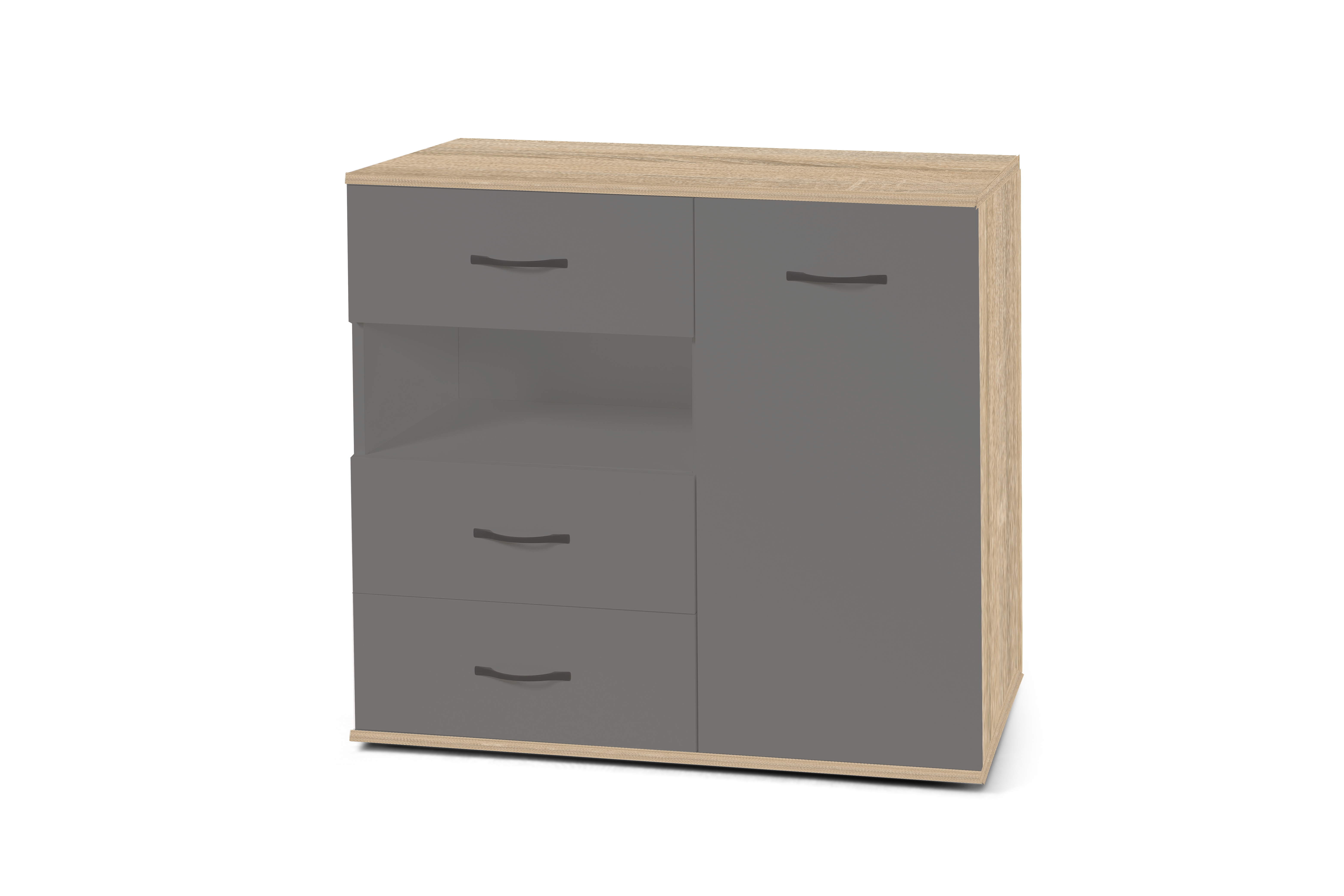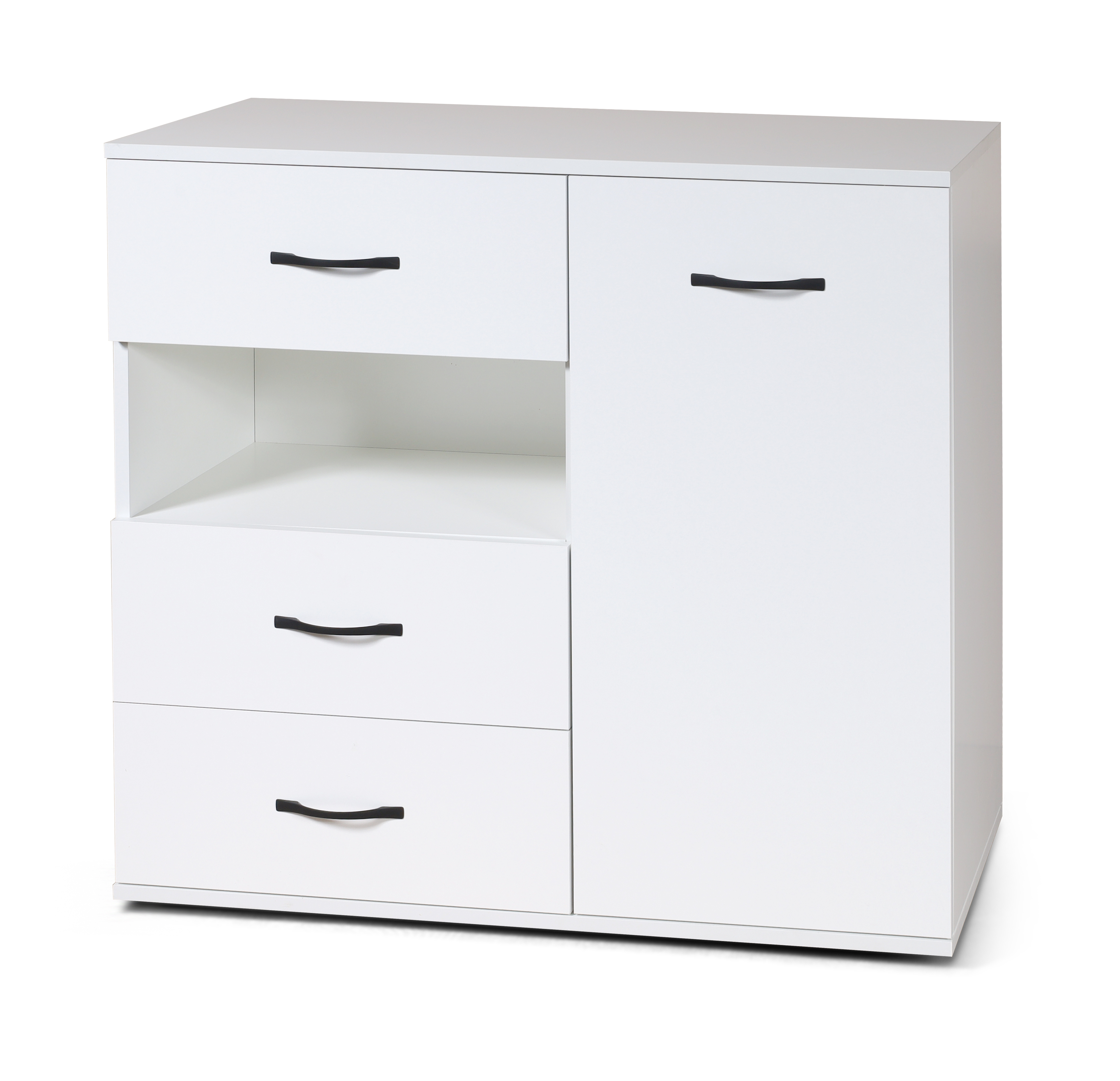 У комода "Виттен" одна секция с распашной дверью с полкой. Боковая секция комода представлена 3 выдвижными ящиками и нишей.