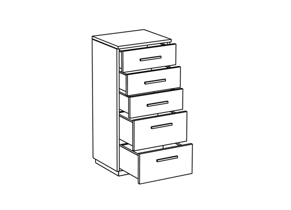 Высокий комод «Fly» крепится к стене. В модели используются направляющие со встроенным доводчиком, обеспечивающим бесшумное и плавное закрывание ящиков. Два нижних ящика имеют больший объем относительно верхних.