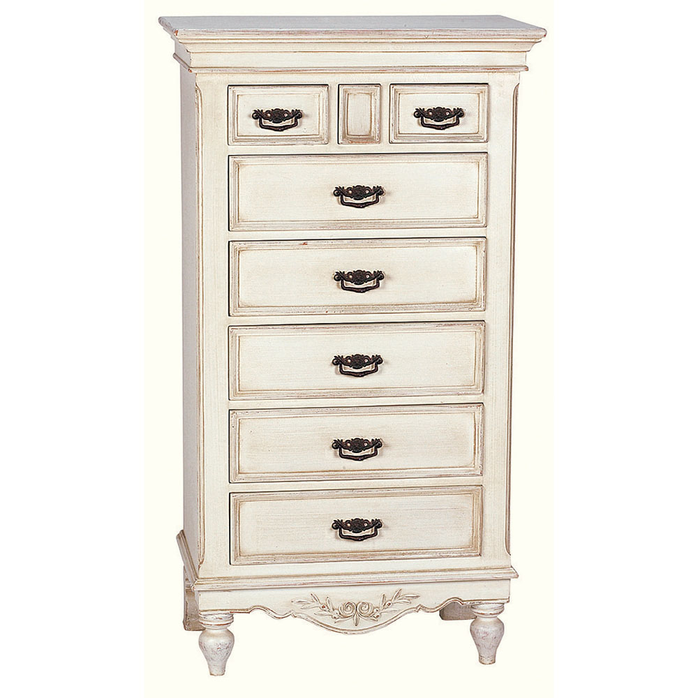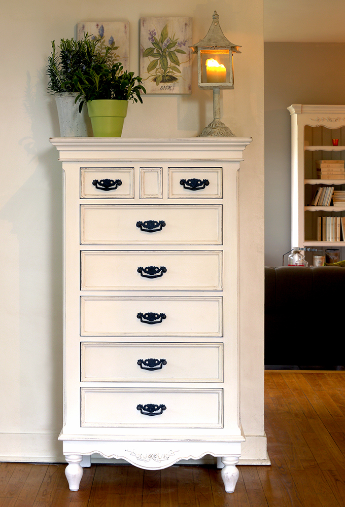 Белый матовый комод декорирован вставками в цвете светлого дуба.