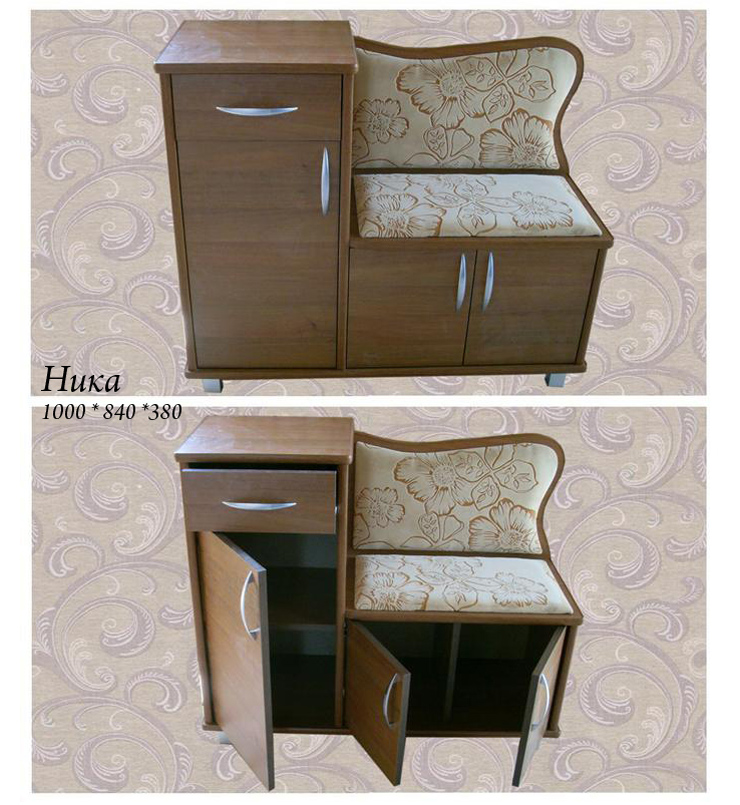 Набор для прихожей представляет собой конструкцию из высокого комода и тумбы. Поверхность тумбы служит сиденьем, предусмотрена мягкая спинка. Фасадные двери комплектуются надежными металлическими ручками. Декором является цветочный принт обивки.