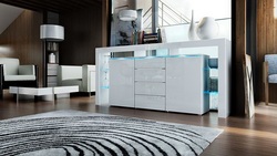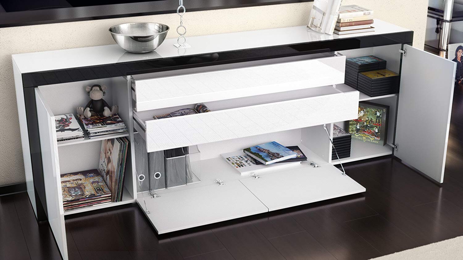 Невысокий удлиненный комод с двумя выдвижными ящиками, откидной дверцей и распашными створками по обе стороны. Прекрасно подходит для гостиной или спальни – в нем можно хранить как белье, так и посуду, книги, полезные мелочи. Модель также пригодна для использования в качестве тумбы под телевизор.